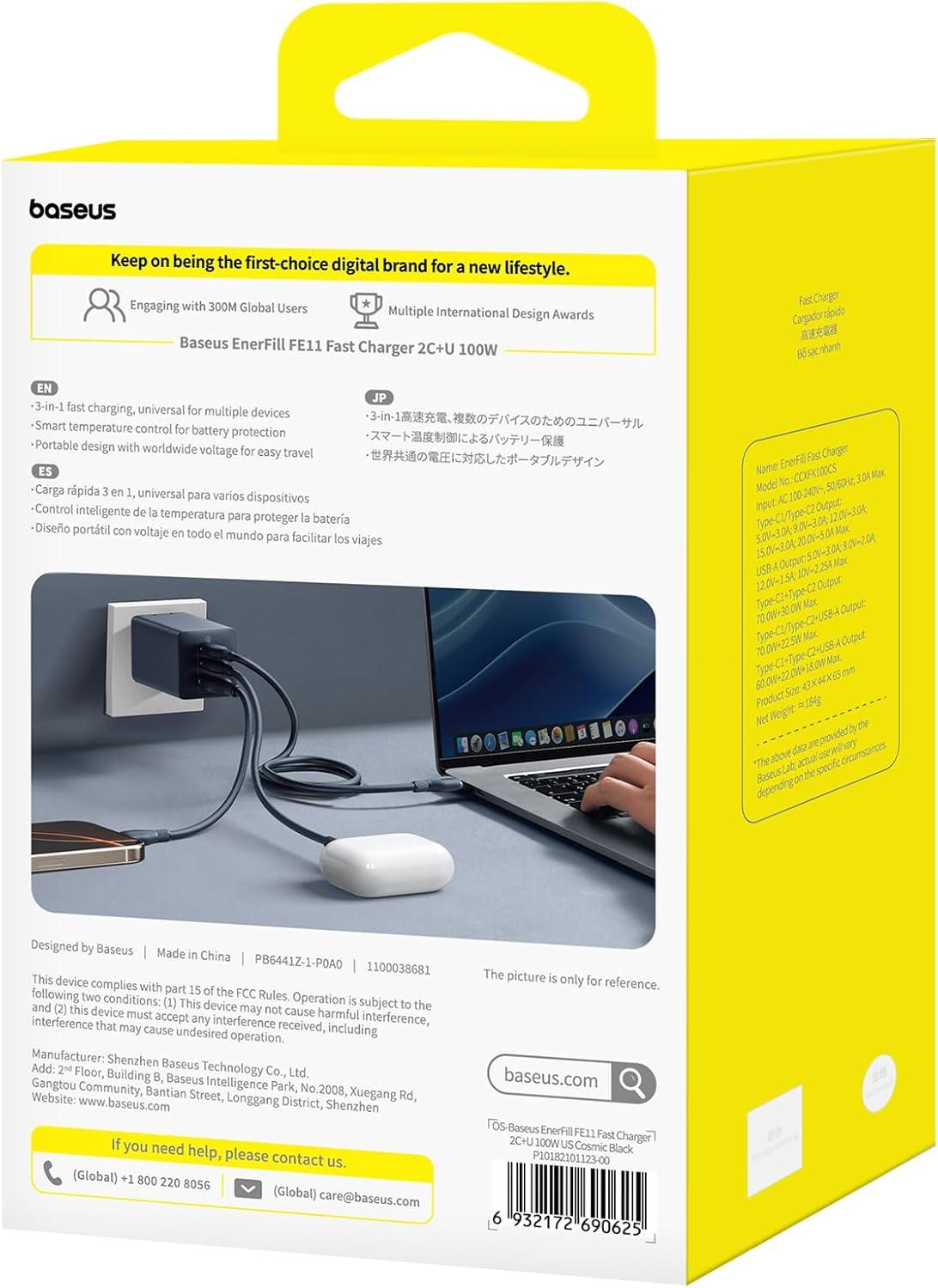 3-in-1 Multi-Port Fast Charger: Equipped with 2× USB-C & 1× USB-A ports, this 100W USB-C charger block supports simultaneous charging for three devices. And Baseus exclusive BPS 3.0 smart power allocation tech dynamically delivers optimal power to each connected device, ensures stable and efficient multi-device charging.