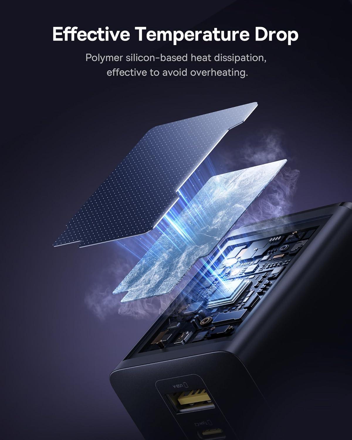 Effective Temperature Drop: This compact wall charger adopts advanced high-polymer silicon material for superior heat dissipation and the Baseus Cooling technology (BCT) for real-time temperature monitoring. With this efficient thermal management, the 100W USB-C fast charger can stay cool all the time to ensure safe fast charging while extending the battery lifespan for your devices.