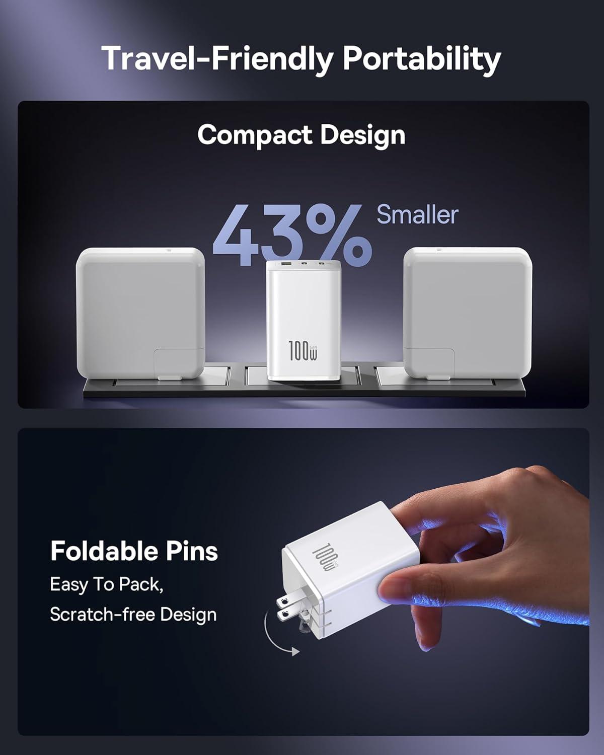 Travel-Friendly Portability: With foldable pins and a compact design, the 100W fast charger is easy to carry and store. Saves more space for wall outlets and power strips, ideal for home, office, and travel.