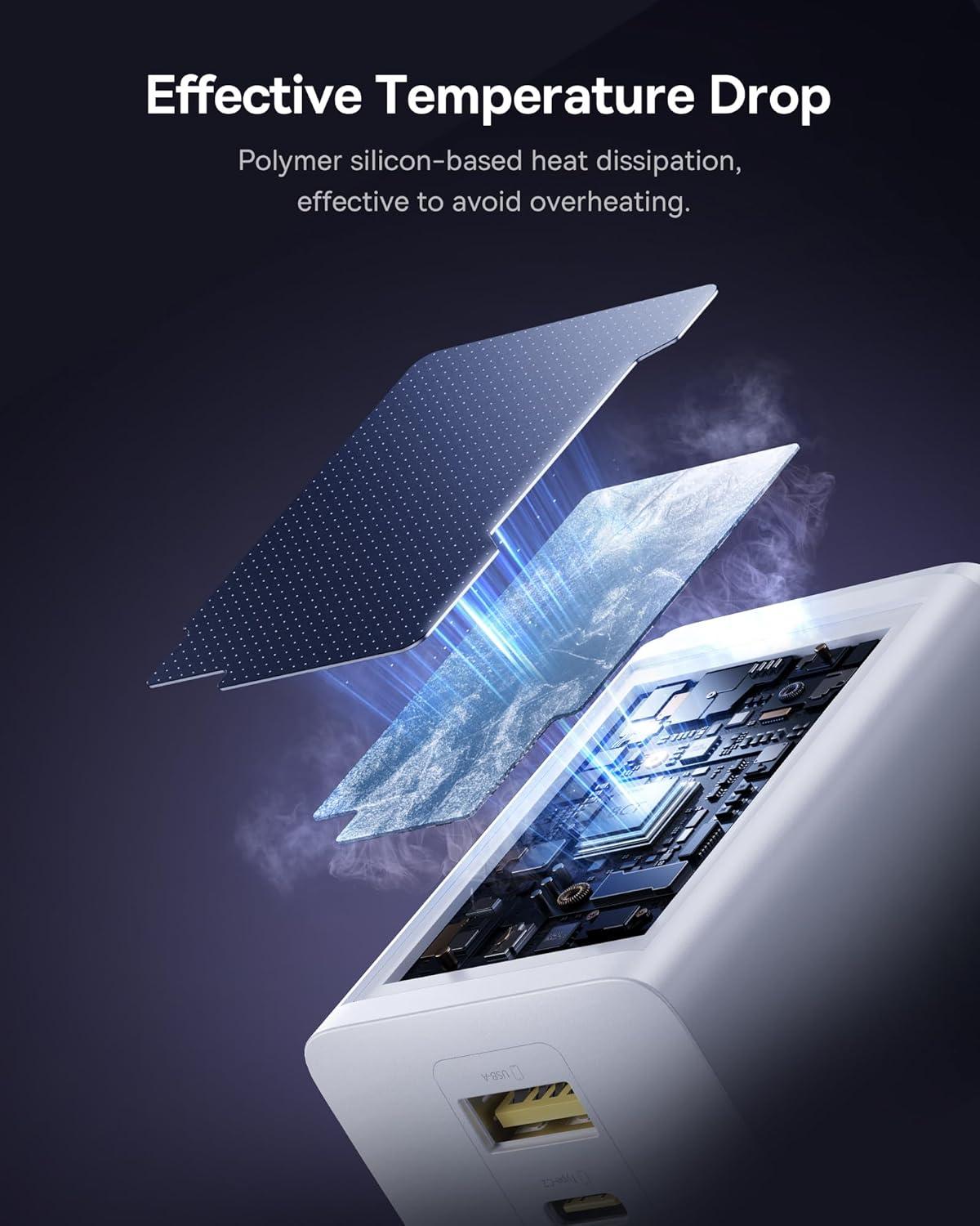 Effective Temperature Drop: This compact wall charger adopts advanced high-polymer silicon material for superior heat dissipation and the Baseus Cooling technology (BCT) for real-time temperature monitoring. With this efficient thermal management, the 100W USB-C fast charger can stay cool all the time to ensure safe fast charging while extending the battery lifespan for your devices.
