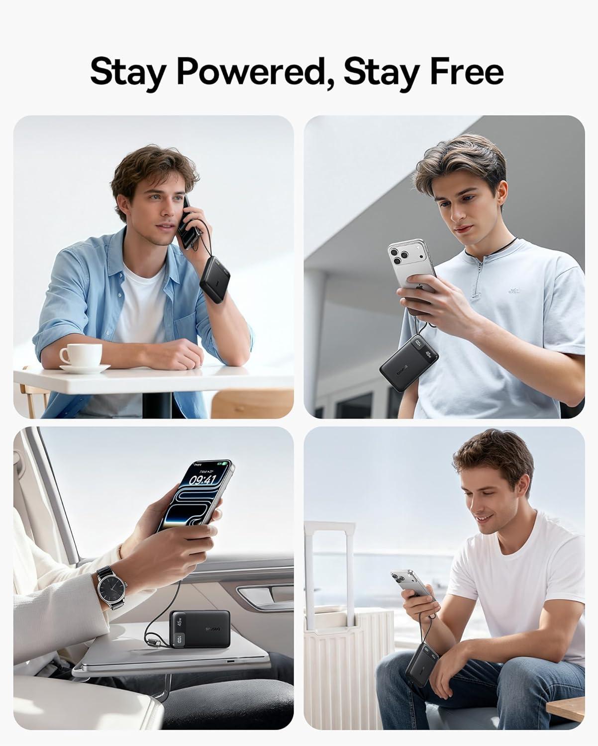 Dual Built-in USB-C Cables: Experience clean, clutter-free charging with two integrated USB-C cables that eliminate the need for extra cables. Both cables of the USB-C power bank have been tested to withstand over 20,000 pulls and bends. Power up your devices instantly and lastingly by this portable charger USB-C, or share a cable with someone else when needed.