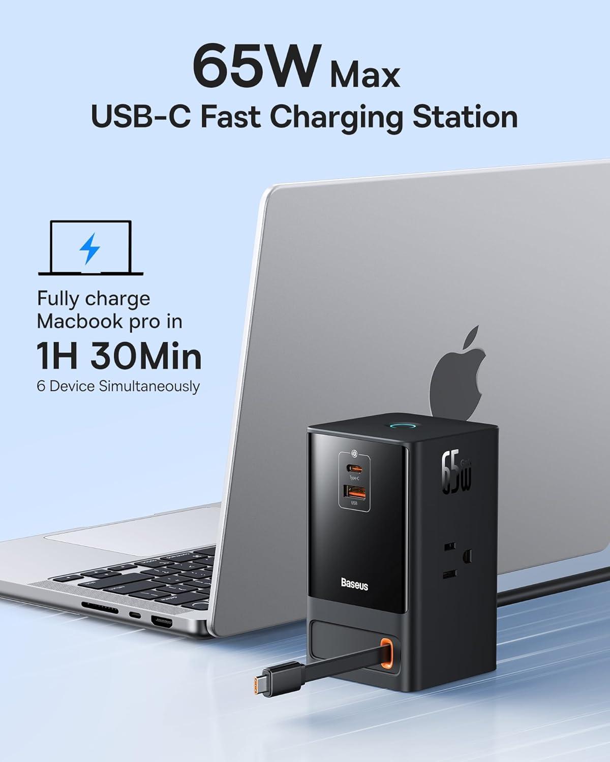【What’s in the Box】 Baseus 65W Fast Charging Power Strip, manual, reusable nano tape to secure it, 12-month warranty, and our prompt support team to assist you. Note: retractable cable is about 2.6ft; and 5ft power cord is undetachable