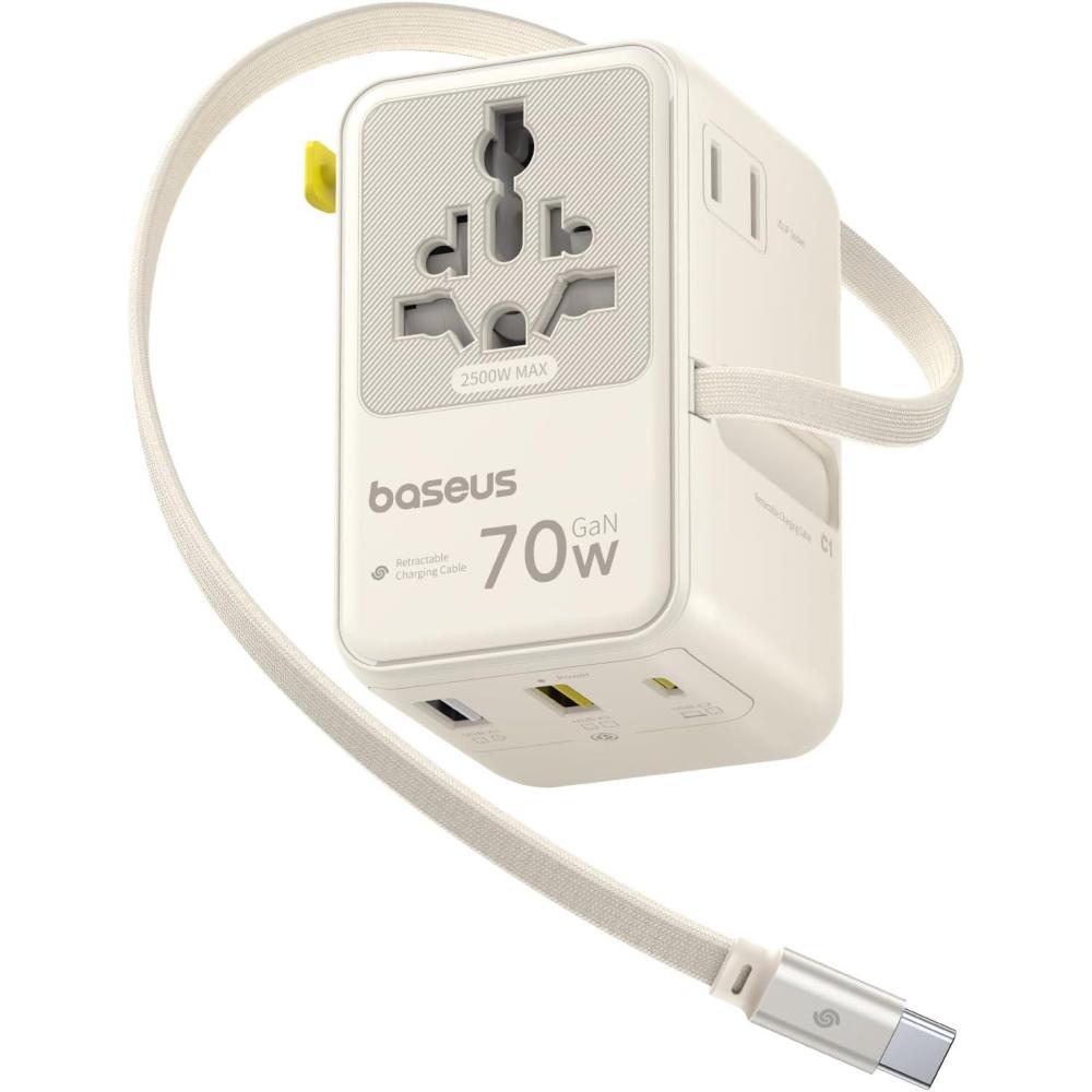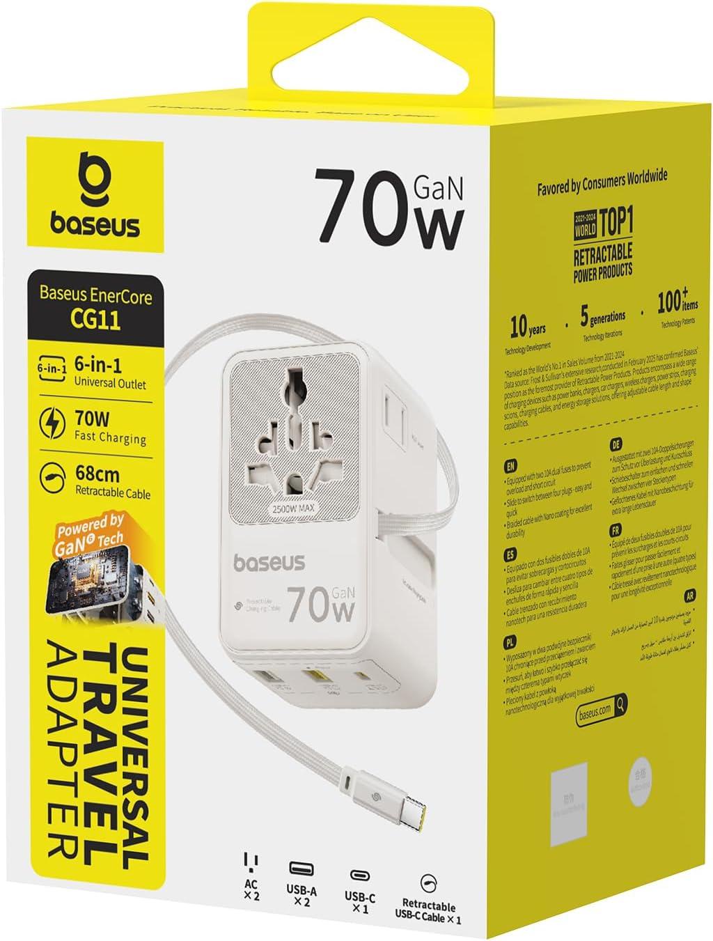 Baseus 70W Universal Travel Adapter with Retractable Cable, 6-in-1 International Plug Adapter, USB-C PD Fast Charging Worldwide Wall Charger for USA/EU/UK/AUS and Over 200 Countries - Enercore CG11(70W-Off White)