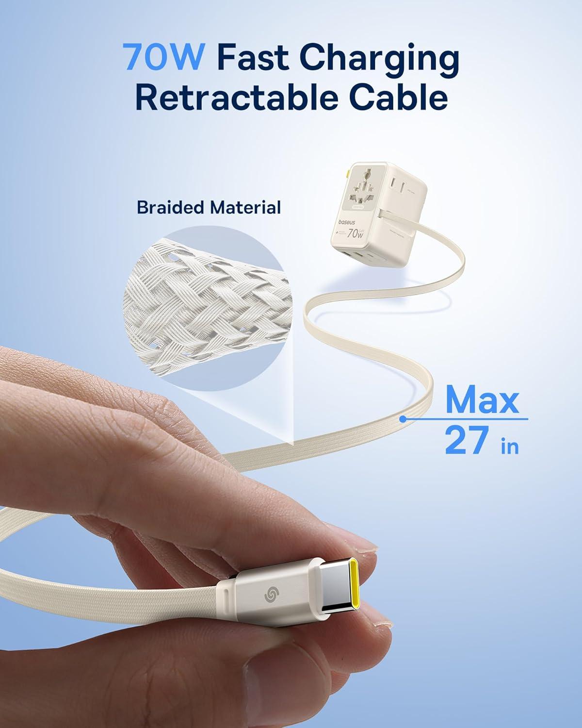[Bult-in 70W USB-C Retractable Cable] – Baseus international plug adapter can deliver up to 70W Max. with the built-in retractable USB-C cable, that was braided with nylon to withstand wear and tear in daily use. Just pull to charge anywhere, anytime, no need to carry extra cables.