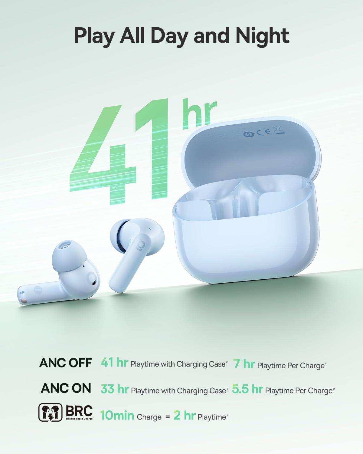 41-Hour Battery Life: Get up to 7 hours per charge and 41 hours total playtime (ANC off) with these in-ear ear buds providing all-day power and keeping you going without interruptions. For extended playtime, you can speed charge an extra two hours in just 10 minutes