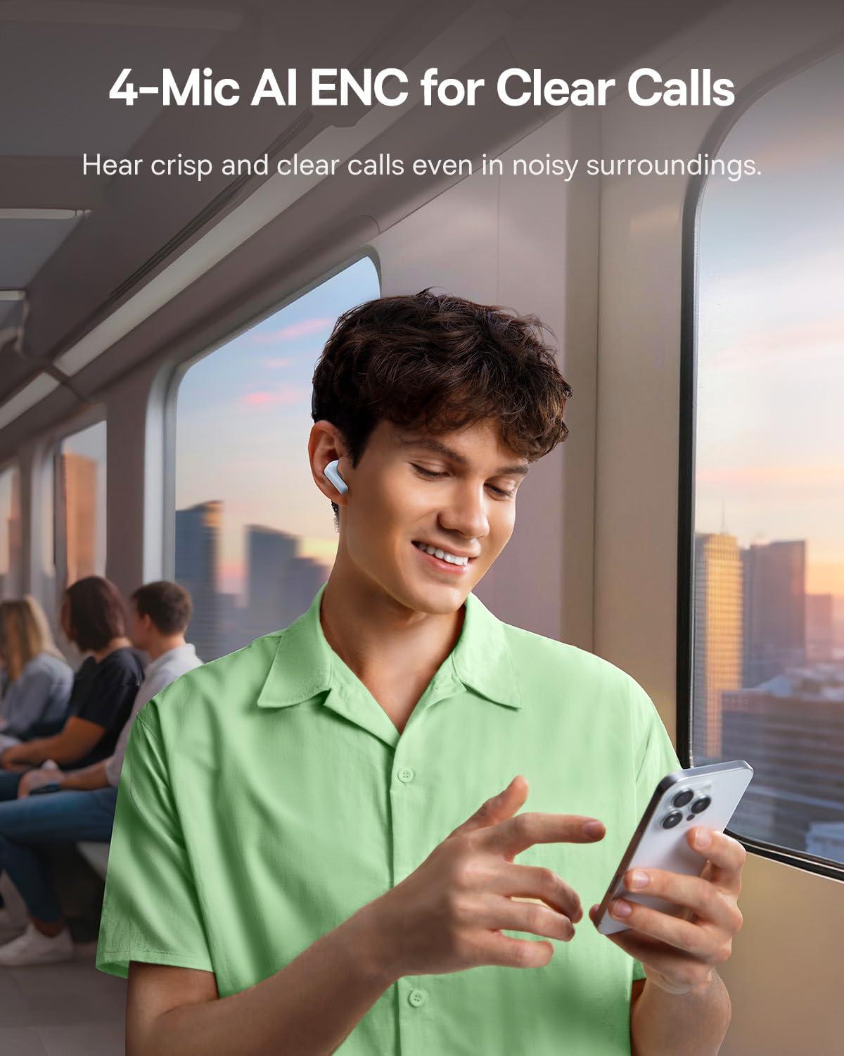 4-Mic AI Clear Calls: These Bluetooth earbuds feature 4-mic AI ENC technology that effectively isolates your pure voice from distractive background noise, ensuring your voice remains clear and crisp during every call whether you're in meetings, commuting, or outdoors in windy conditions.