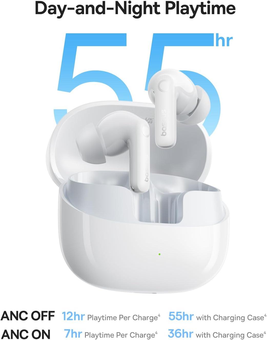 [Day-and-Night Playtime]: Enjoy up to 12 hours of playtime on a single charge and 55 hours with the case (ANC off), or 7 hours per charge and 36 hours total (ANC on). A quick 10-minute Baseus Rapid Charge (BRC) gives you 2.5 more hours of music—perfect when you're in a rush