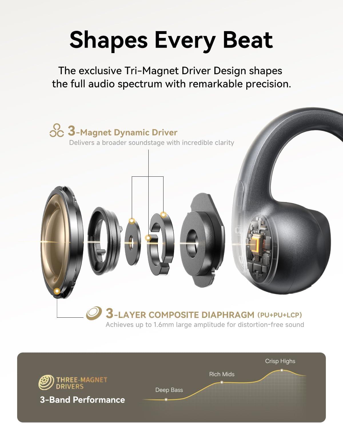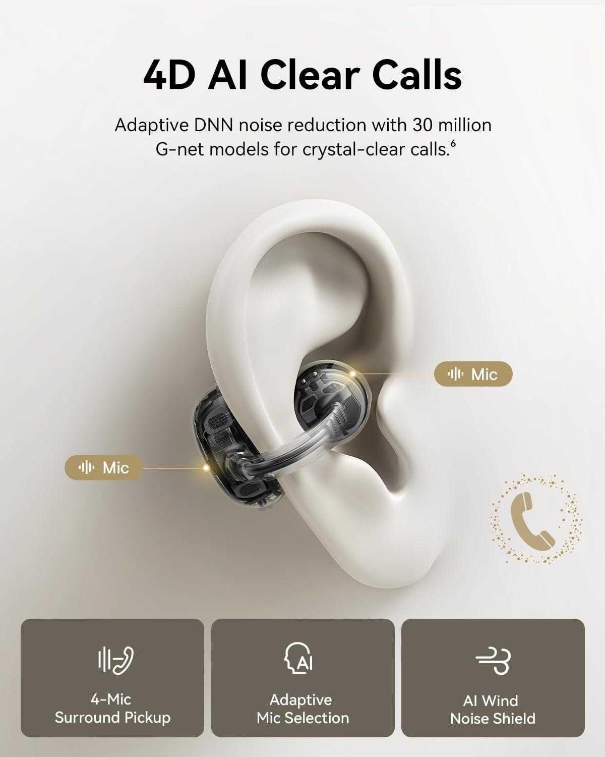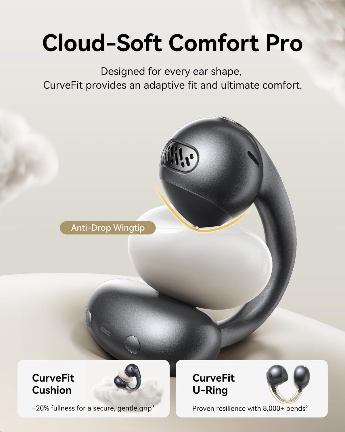 All-Day Clip-On Comfort: The open-ring clip earbuds feature ultra-soft, resilient CurveFit cushions, anti-drop wingtips, and a flexible TPU U-ring with memory titanium wire tested for 8,000+ bends. At just 5g, these open-ear earbuds are designed to offer a breathable, adaptive, secure fit with cloud-like comfort for various ear shapes without irritation and pressure
