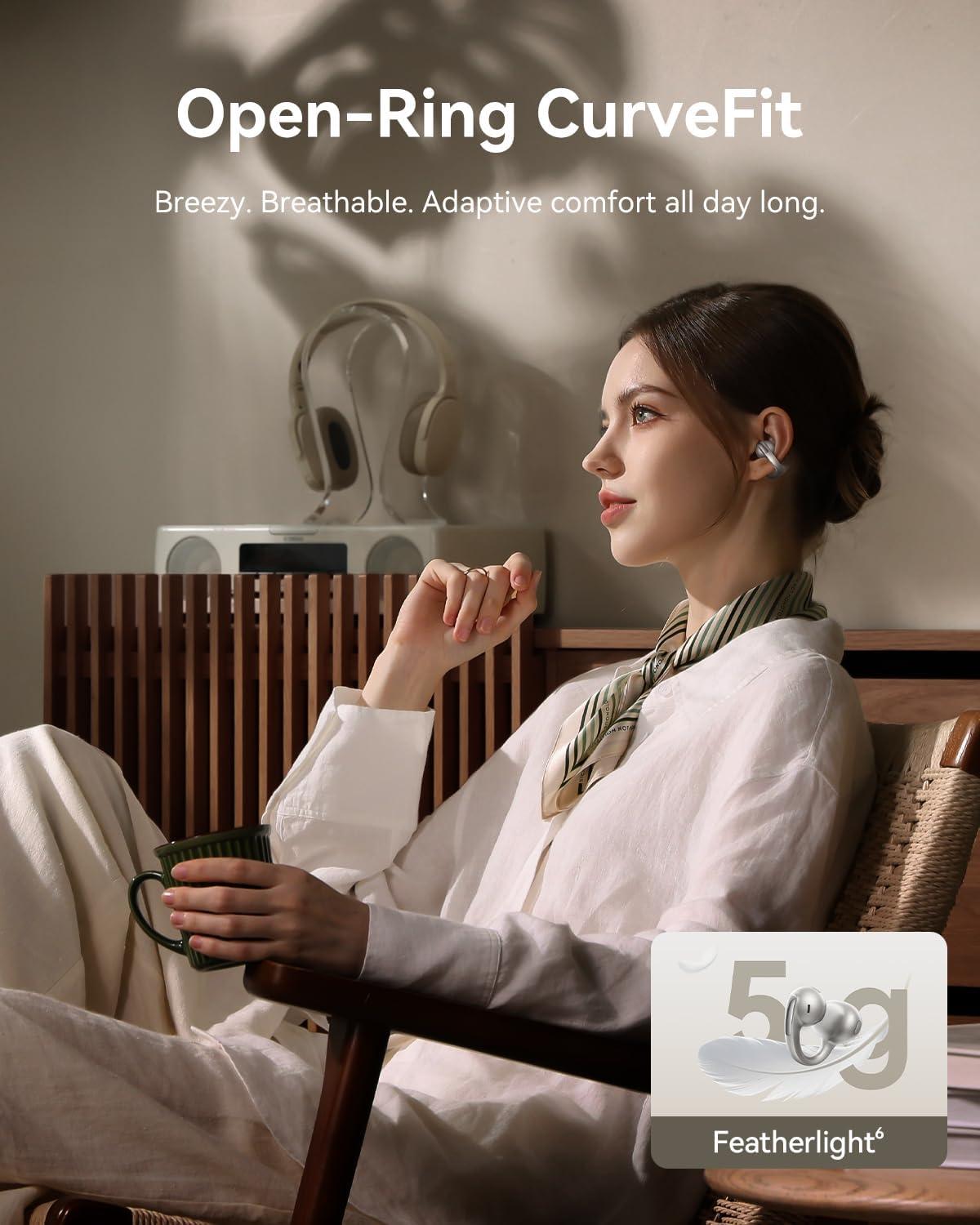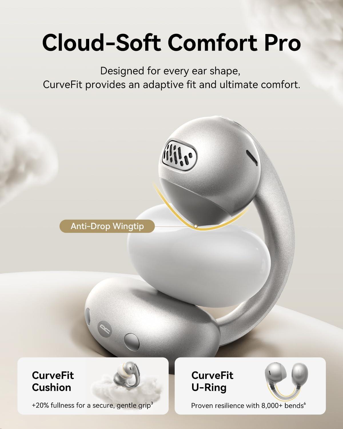 All-Day Clip-On Comfort: The open-ring clip earbuds feature ultra-soft, resilient CurveFit cushions, anti-drop wingtips, and a flexible TPU U-ring with memory titanium wire tested for 8,000+ bends. At just 5g, these open-ear earbuds are designed to offer a breathable, adaptive, secure fit with cloud-like comfort for various ear shapes without irritation and pressure