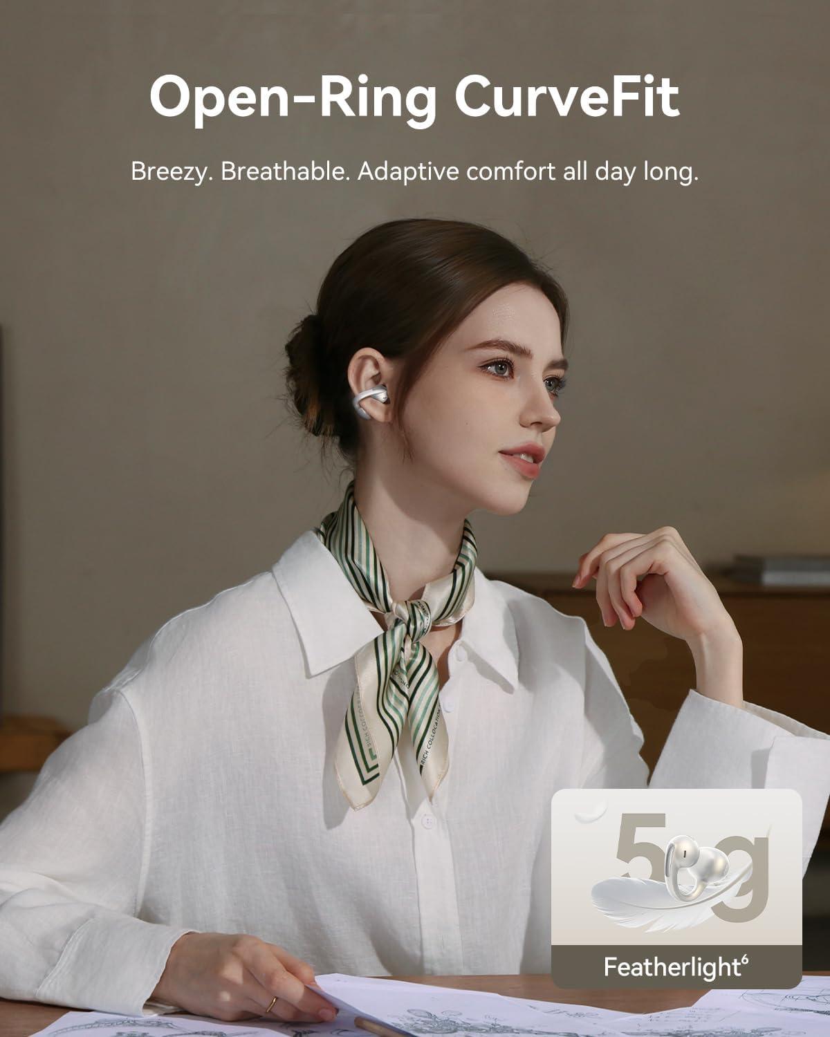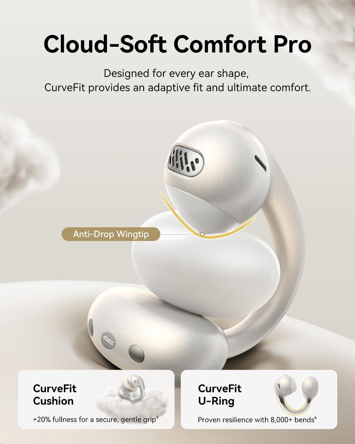 All-Day Clip-On Comfort: The open-ring clip earbuds feature ultra-soft, resilient CurveFit cushions, anti-drop wingtips, and a flexible TPU U-ring with memory titanium wire tested for 8,000+ bends. At just 5g, these open-ear earbuds are designed to offer a breathable, adaptive, secure fit with cloud-like comfort for various ear shapes without irritation and pressure