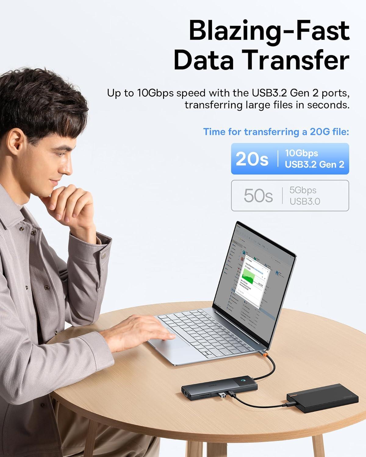 Super-Fast 10Gbps Data Transfer: Up to 10Gbps data transmission speed with the 2 USB 3.2 ports including 1 USB-C Data Port and 1 USB-A Data Port, transferring your big files and pictures in seconds. And the SD/TF card slot allows you to read your memory cards at the same time with speed up to 104MB/s.You can quickly access and transfer your important data without any delays.