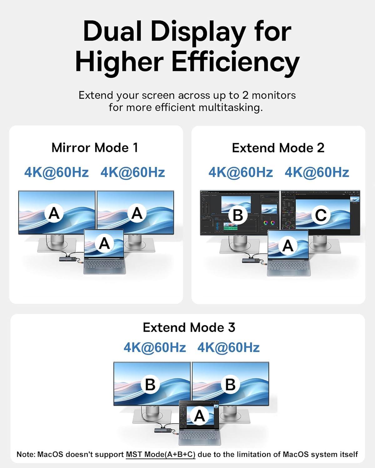 Dual Display with 4K Clarity: Just cast your screen by using one HDMI port of our laptop docking station and enjoy the stunning 4K@120Hz clarity. Or experience the ultimate visual delight with dual display in 4K@60Hz resolution on both HDMI ports. Immerse yourself in a truly remarkable viewing experience that will captivate your eyes. *Note: Due to the limitation of macOS itself, all extended screen content will be the same. And 4K@120Hz output can be achieved With Windows Laptops under Thunderbolt 4 or DP1.4.