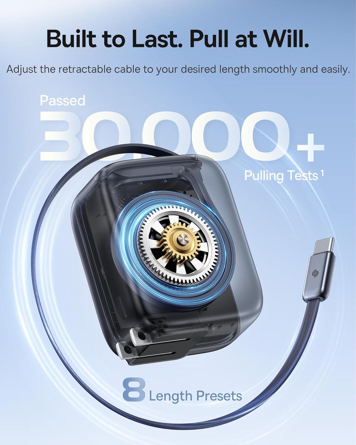 Retractable USB-C Charger: The Dual usb c charger block features a handy 32-inch Retractable USB C Cable. The handy cable will keep you ready whenever your phone or tablet needs a quick boost. It's the ideal charger to keep your travel light.