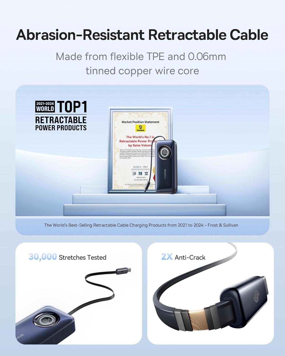 Baseus Enercore Power Bank, 20000mAh Fast Charging Portable Charger Built-in 67W Retractable USB-C Cable, Battery Pack for Laptop, iPhone 16/15 Series, Samsung, MacBook, Drone, Outing/Travel Essential(Built-in 67W USB-C Cable)