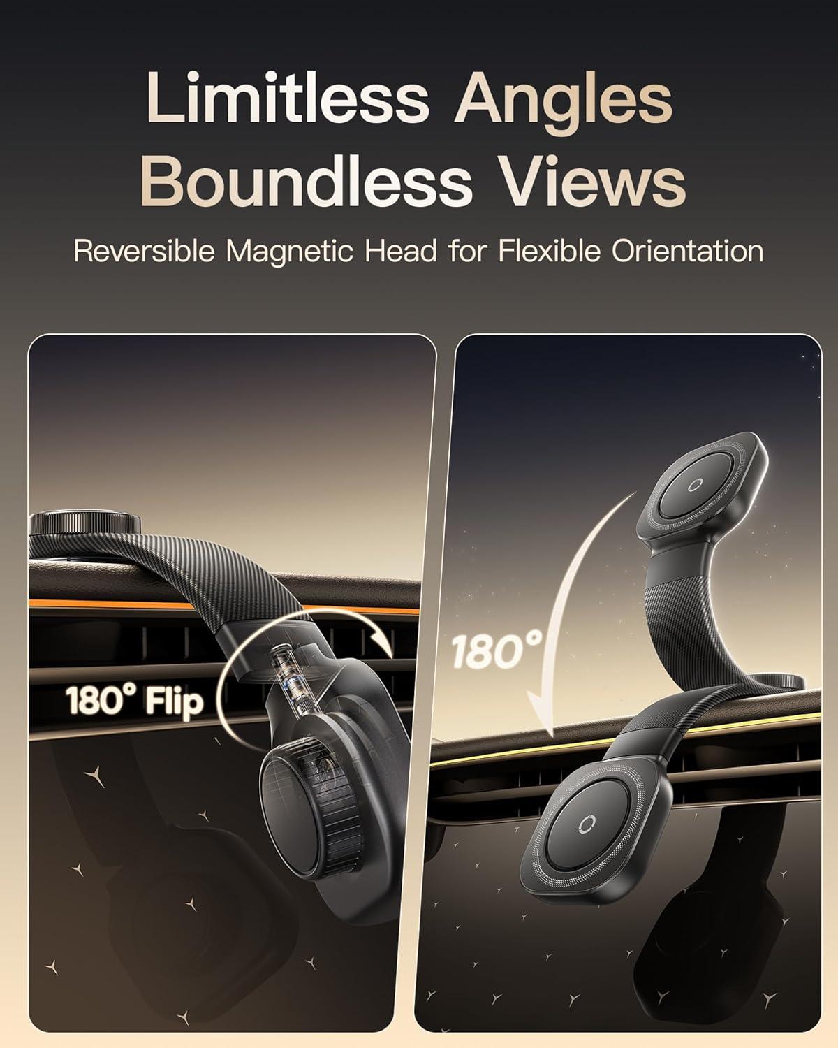 Bend & Rotate Freely for Perfect Viewing: With a 360° swivel base, reversible magnetic head and a flexible aluminum arm, this magnetic phone holder offers the ultimate adjustment for limitless viewing angles. Keep your focus on the road with this magnetic car mount for cell phone
