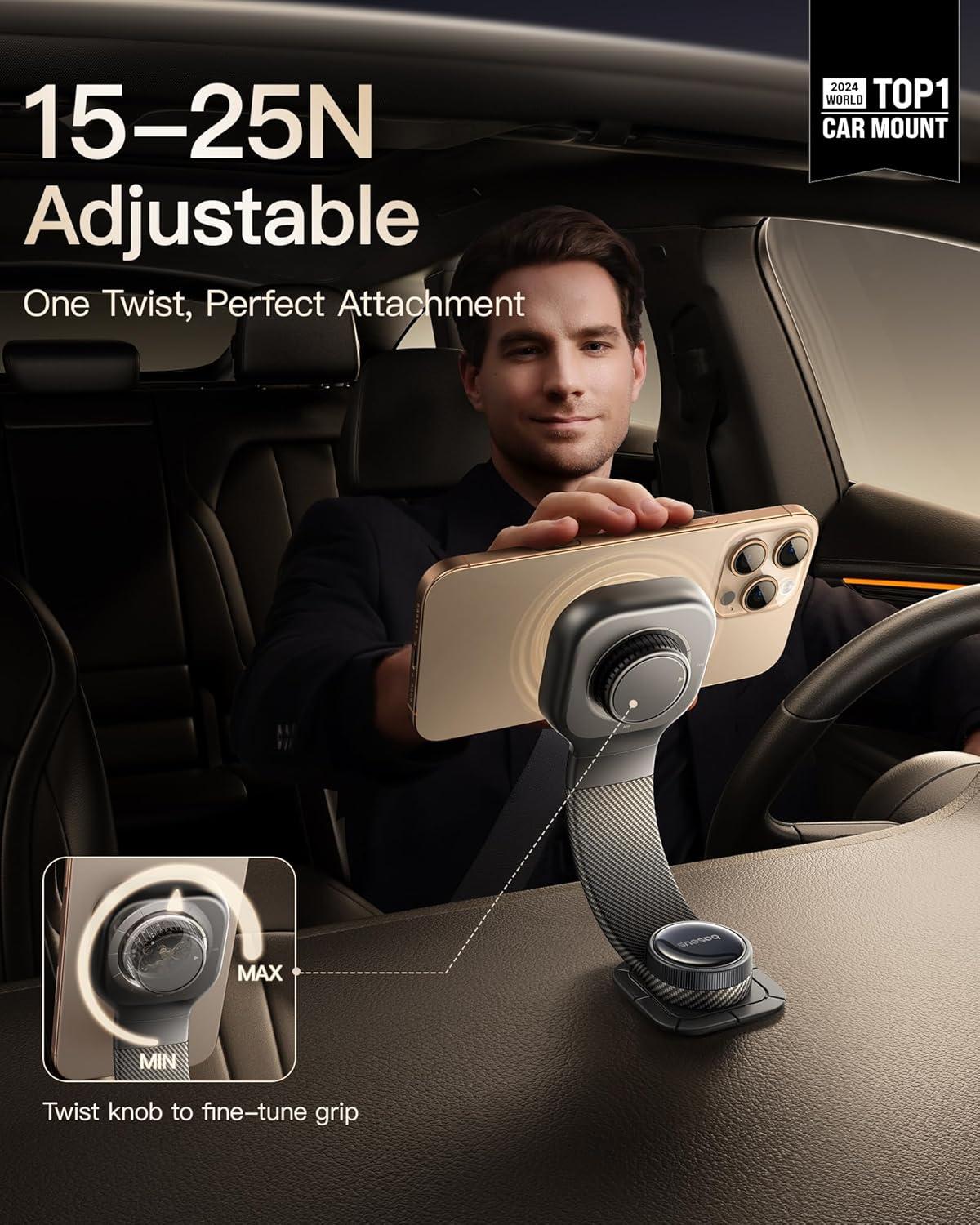Sleek Design, Tool-Free Setup: Crafted with a minimalist Apple Watch-inspired silhouette and Kevlar-textured arm, the C03 magsafe car holder complements any car interior. The all-black finish blends in stylishly, while the no-tools-required installation takes just seconds. An ideal car iphone holder for sleek, modern vehicles