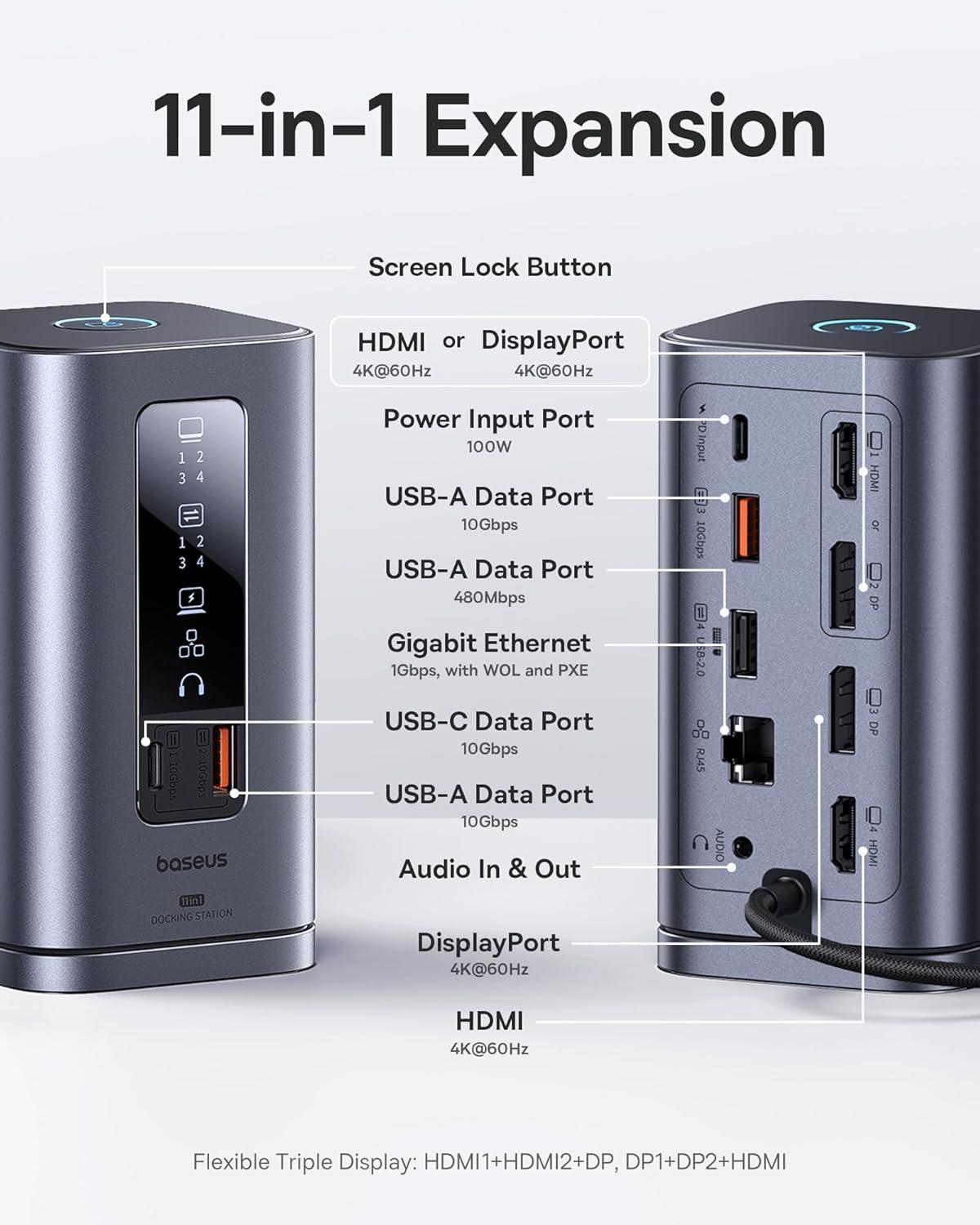 High-Spec 11-in-1 Expansion: This all-in-one USB-C docking station offers 2 HDMI ports, 2 DisplayPorts, 1 USB-C and 2 USB-A 10Gbps data ports, an additional USB-A 2.0 port, 100W USB-C PD input, Gigabit Ethernet, and a 3.5mm AUX jack—covering all your connectivity needs to boost productivity and streamline your workspace.