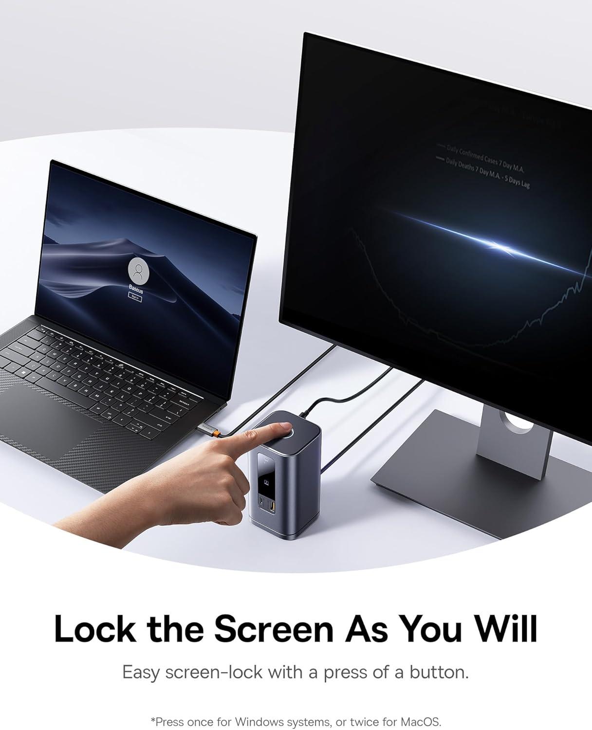 Innovative Upright Design with Screen-Lock: Sleek aluminum finish, vertical stand with magnetic base, and an 80cm cable maximize desk space and convenience. The built-in LED screen shows port connection status, while the screen-lock button lets you instantly secure sensitive information with one touch.
