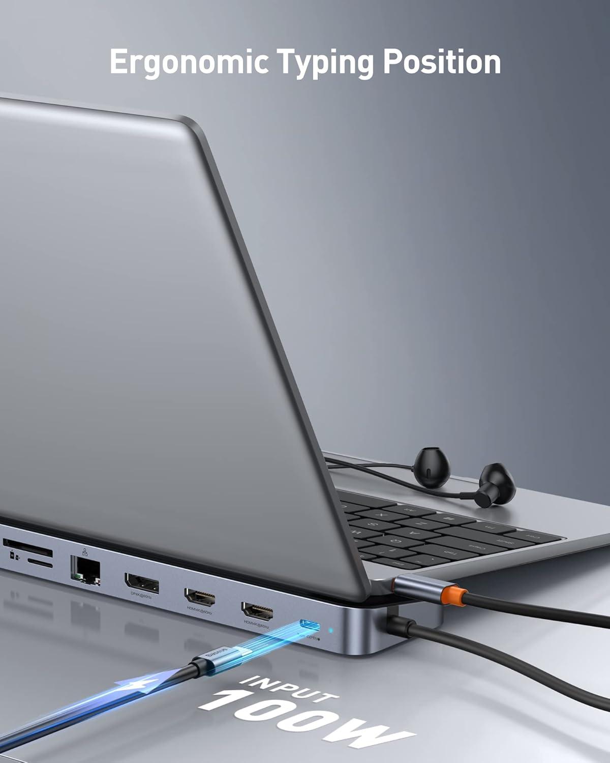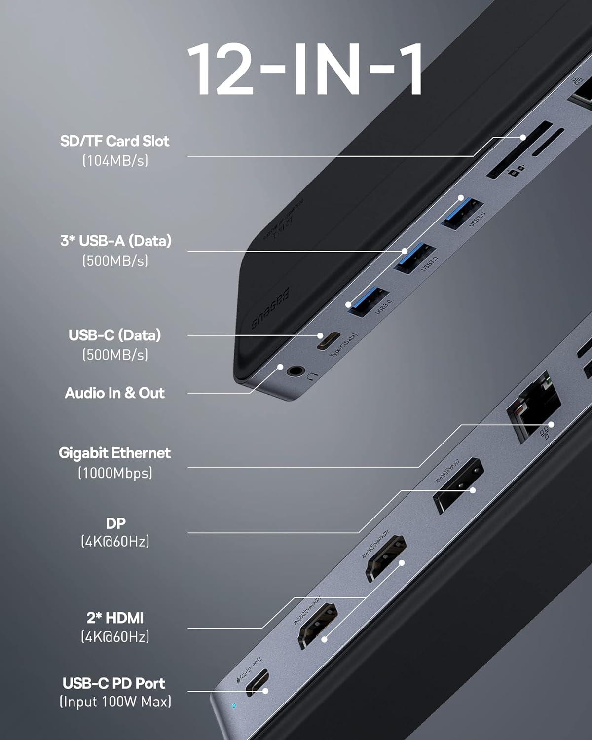 12-in-1 All-in-One Expansion: Equipped with 3 USB-A 3.0 ports, 1 USB-C 3.0 port, Gigabit Ethernet, 4K HDMI, 4K DP, TF/SD card readers, audio jack,100W PD charging port — everything you need for seamless connectivity in one compact docking station 3 monitors