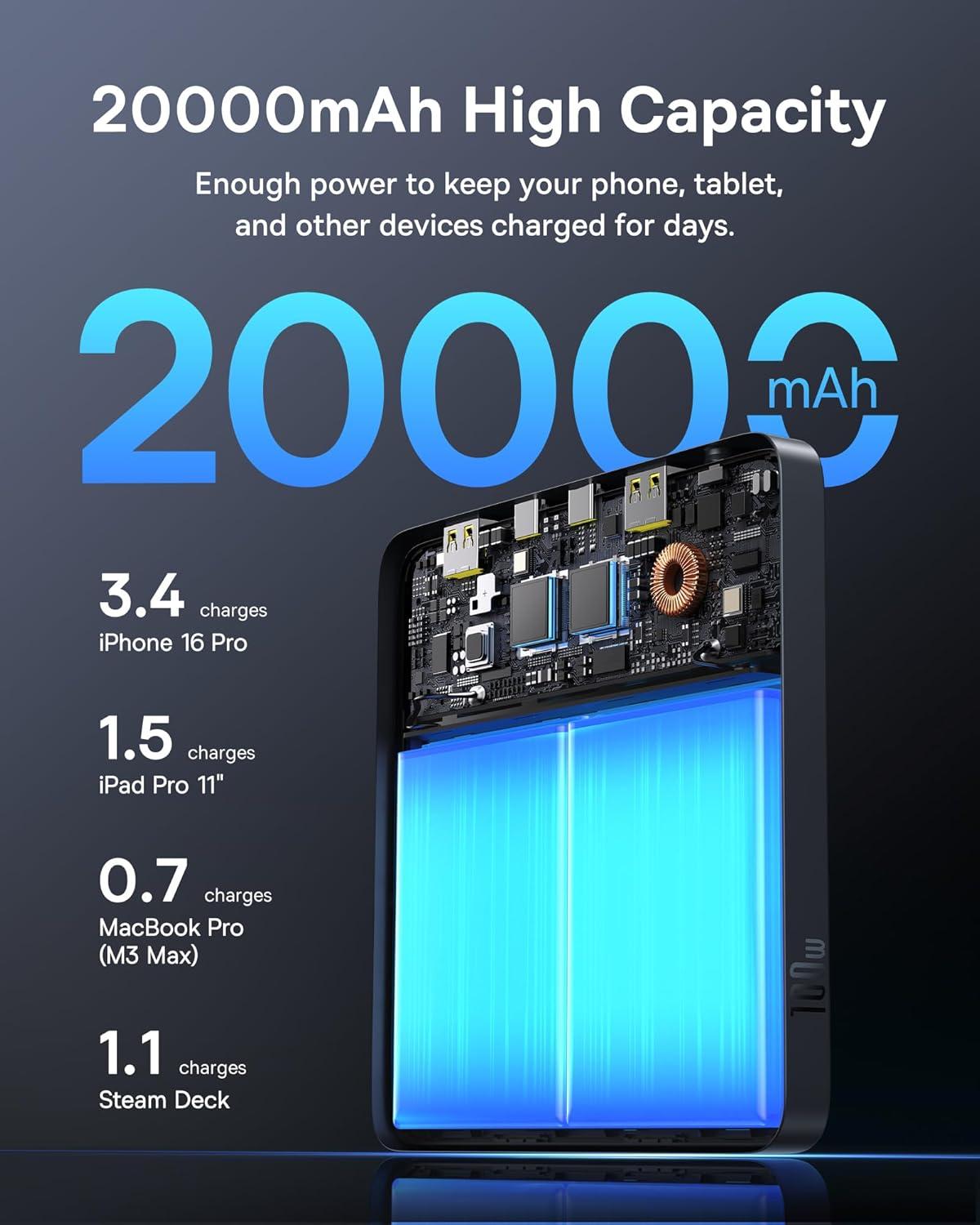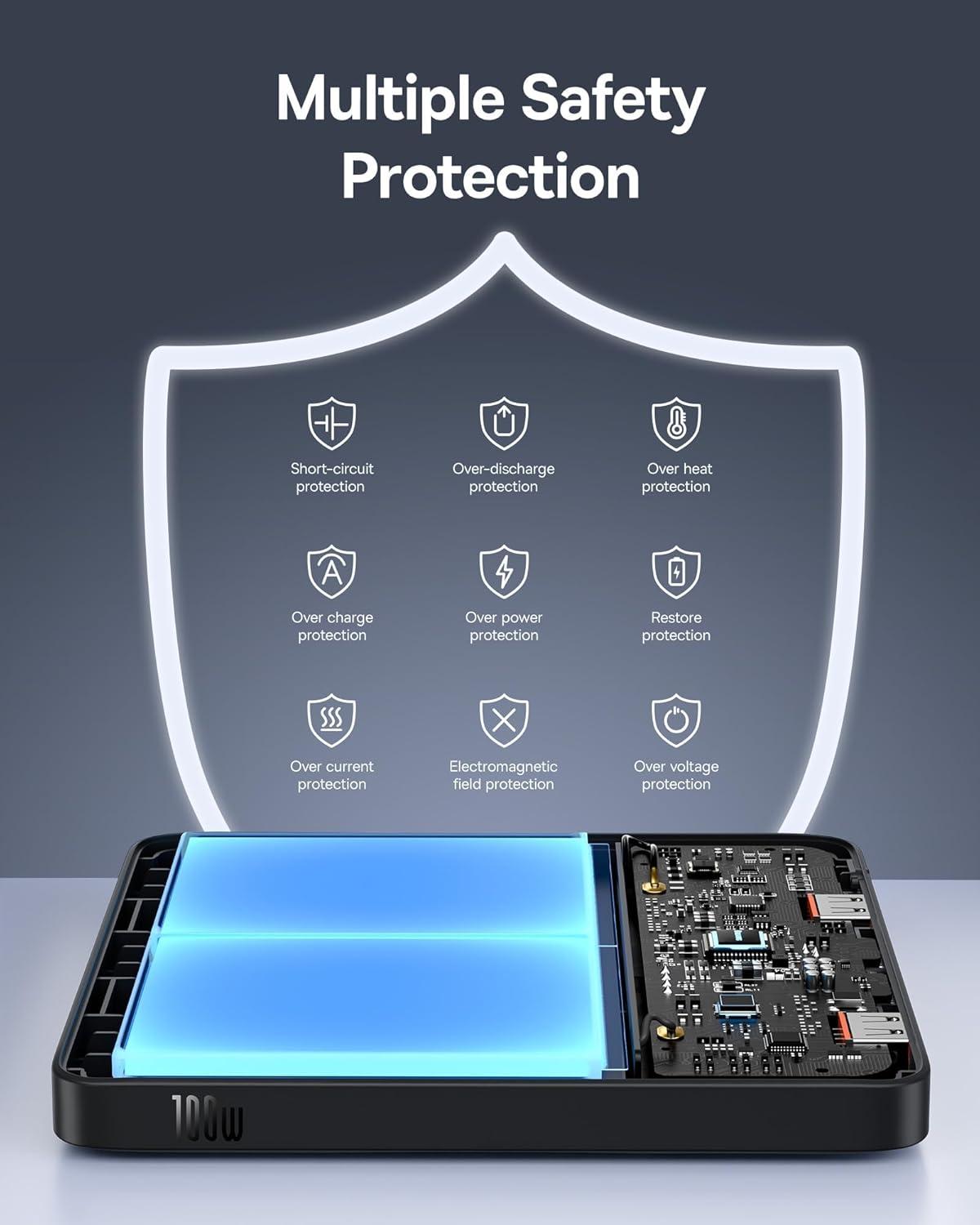 🔋 【Safety & Compatibility Assurance】: Advanced overcharge/overheat/short-circuit protection certified by UL/IEC and other authoritative reports ensure the safety of your device. The 100W power bank is compatible with MacBook Pro/Air, Galaxy series, iPhone 16/15/14/13/12 series, iPad, AirPods, Dell XPS, Steam Deck and more.