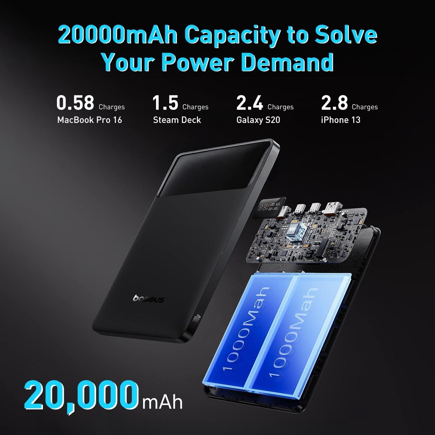 【What You Get】Baseus 100W Laptop Power Bank supports PD 3.0, QC.4.0, SCP, FCP fast charging protocols supported by common devices.The built-in chip powered by BPSⅡ (Baseus Power Split) technology keeps you and your devices safe from overheat, short-circuit, and over discharging. The package consists a Baseus 100W 20000 mAh Power Bank, a USB-C to C 100W cable, and our 24-month Customer Care.