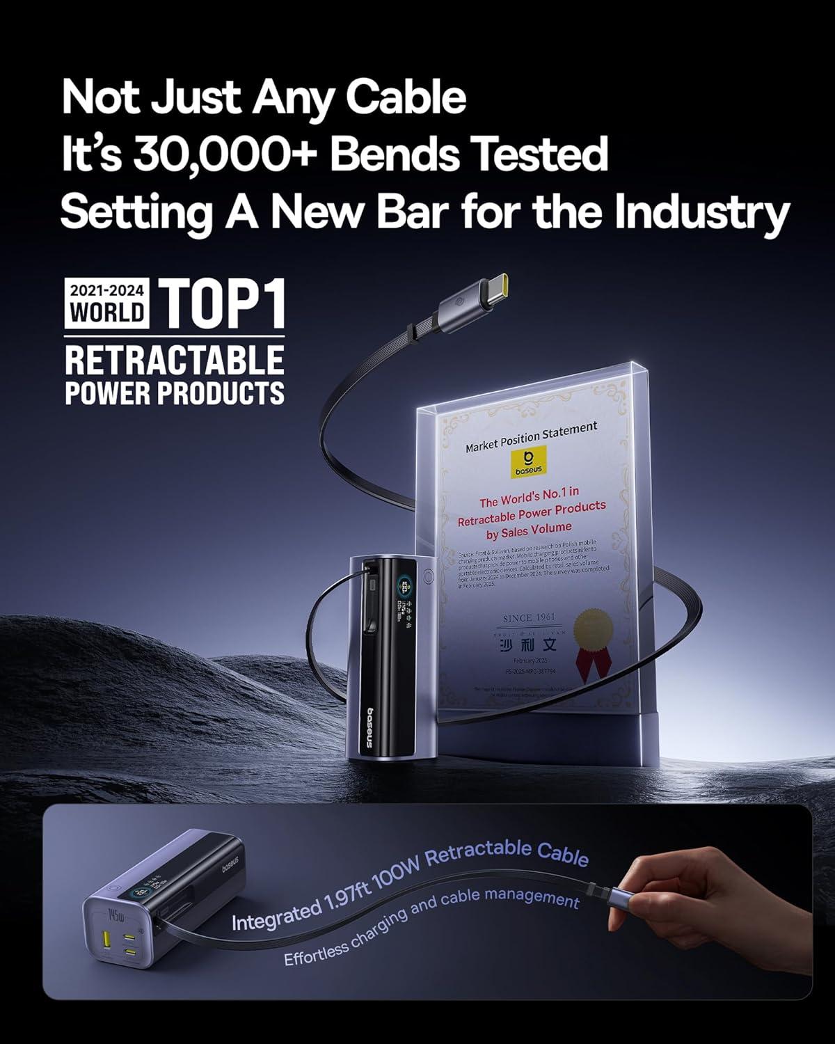 2️⃣ 【Built-in 100W Retractable Cable (1.97ft)】 Tangle-Free & Durable, no more messy cables! The power bank's built-in retractable USB-C cable pulls out for instant charging and retracts with a gentle tug. Tested to withstand 30,000 stretches, it’s built for convenience and longevity.