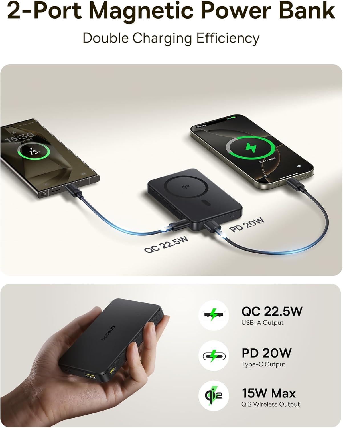 ✅【𝐃𝐮𝐚𝐥 𝐅𝐚𝐬𝐭 𝐂𝐡𝐚𝐫𝐠𝐢𝐧𝐠 𝐏𝐨𝐫𝐭𝐬】Other MagSafe Battery Pack only have ONE USB-C port, by contrast, our QI2 MagSafe battery pack comes with 2-Port: 1*22.5W USB-A and 1*20W USB-C. Supports wired charging for up to two devices simultaneously. Offering versatile charging options for your Phones, Pads, and other devices.