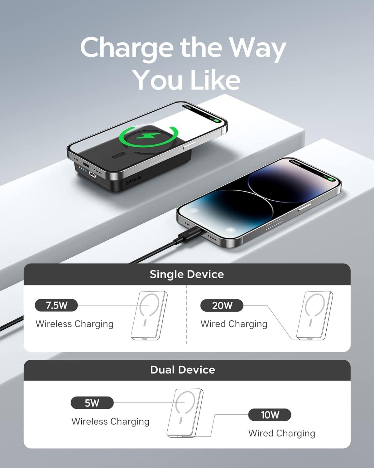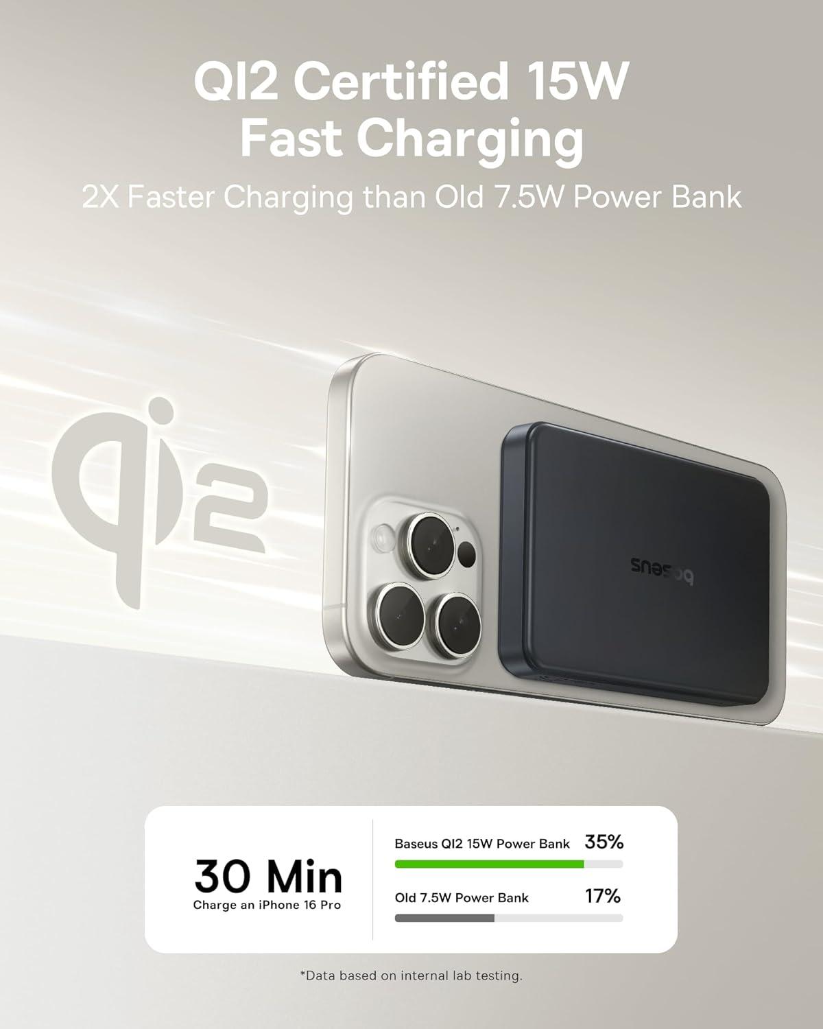 ✅【𝐐𝐢𝟐 𝐂𝐞𝐫𝐭𝐢𝐟𝐢𝐞𝐝 𝟏𝟓𝐖 𝐖𝐢𝐫𝐞𝐥𝐞𝐬𝐬 𝐂𝐡𝐚𝐫𝐠𝐢𝐧𝐠】Different from old 7.5W MagSafe portable charger in market, Baseus Qi2 power bank can release authentic 15W high-speed charging, 2X faster than old 7.5W QI standard. Maximizing compatibility and charging efficiency for your iPhone, get your iPhone 16 Pro from 0 to 35% in just 30 minutes. And backed by Qi2 official certification (QI2 ID: QI-22047), seamlessly compatible with Mag-Safe.