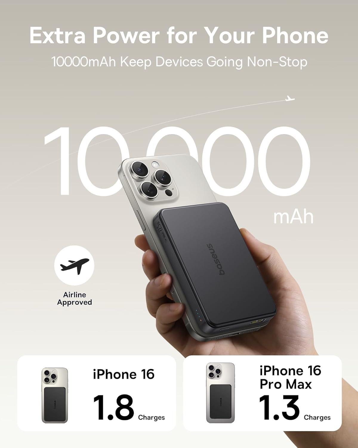 Baseus Magsafe Portable Charger for iPhone, 10,000mAh 15W Magnetic Power Bank, Qi2 Certified Fast Charging Wireless Battery Pack, 22.5W USB-A & 20W USB-C for iPhone 17/16/15/14/13/12, 2025 Version(Black)