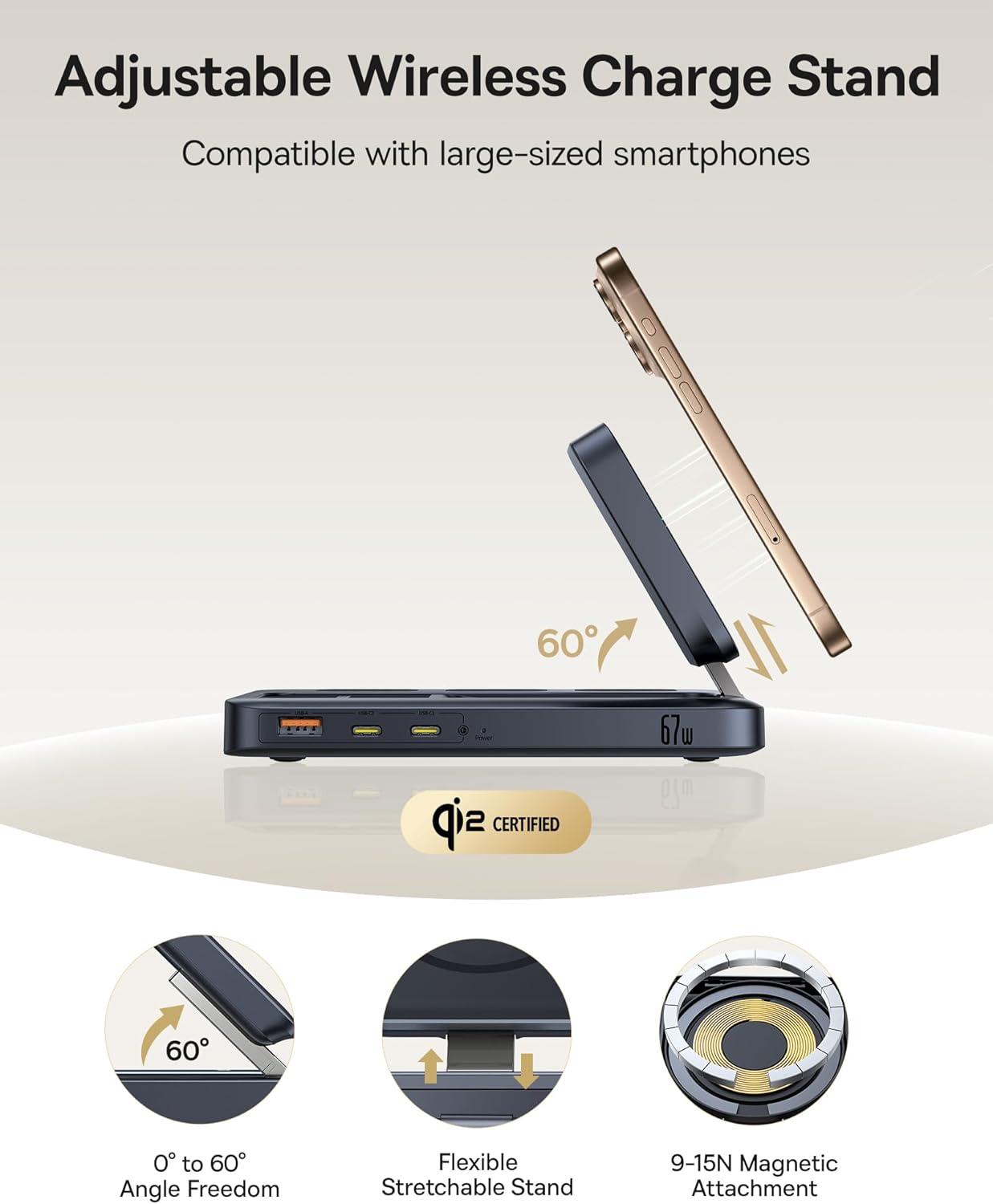 Visualized LCD Display for Peace of Mind: The 3″ LCD digital display of the MagSafe charging station shows real-time charging data at a glance. Toggle between total output, individual port power, and overall performance with a single press. The hollow base design enhances airflow for passive cooling—no fans, no noise, just stable performance for everyday use.
