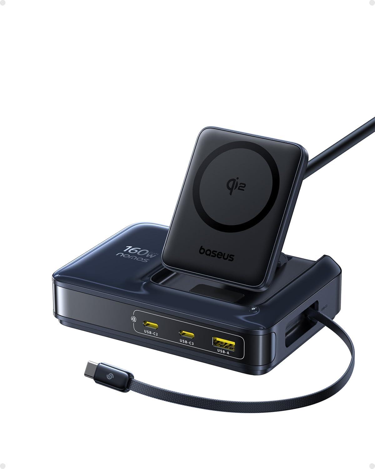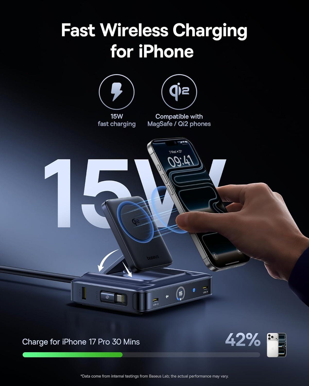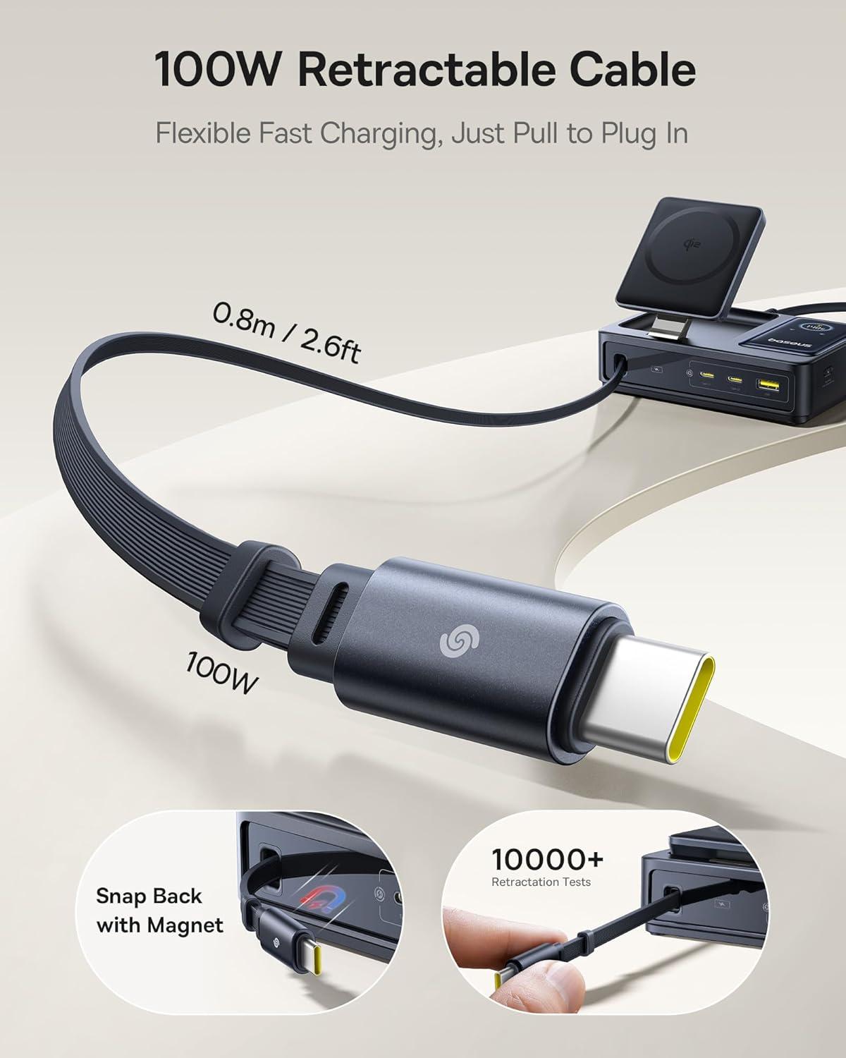 Clean Desk with Dual Retractable Cables: Say goodbye to cable clutter with Baseus Nomos retractable charging station. The dual built-in 80 cm/31.5 inches braided USB-C cables are tested for 35,000 pulls and feature precision damping gears for smooth pull-out and one-touch retraction. A smart charging station with retractable cables keeps your desk tidy, saves space, and reduces trip hazards—perfect for a modern workspace.