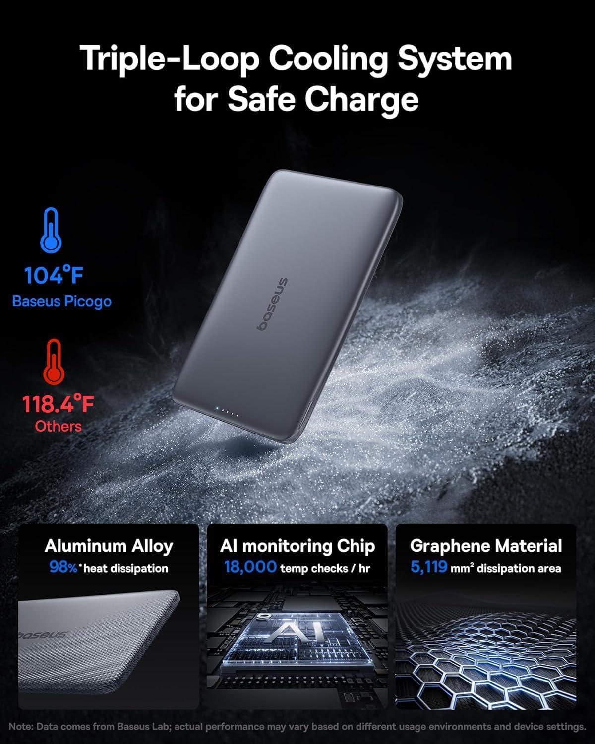 🛡️【Pro-Grade Battery Protection】: Powers your device smarter with Tesla's same battery, NTC temperature control chip, advanced Graphene material, newer shell materials and heat shields, guarantees exceptional cooling and long-term health for battery; this magnetic portable charger stays below 104℉ (14.4 ℉ cooler than the industry standard). Power up with worry-free, confident your device is in expert care. (Note: Slight heating due to efficiency losses in the conversion circuit is normal.)