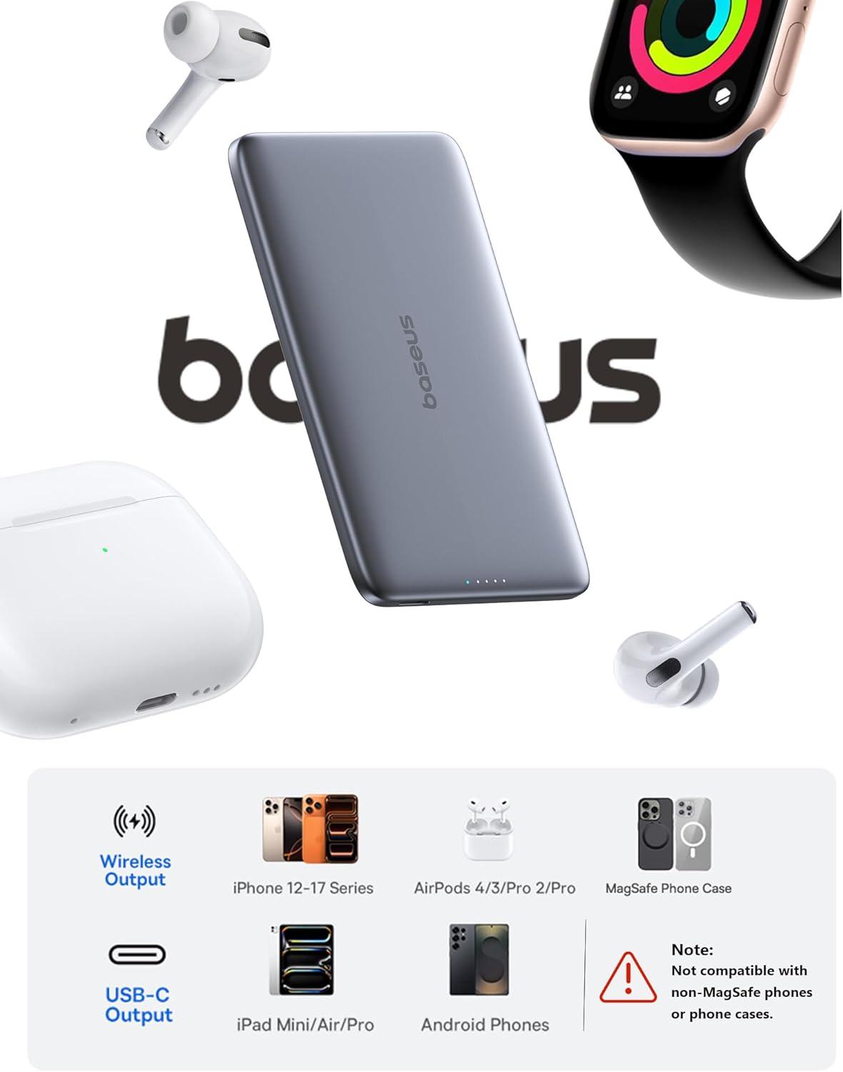 ⚡️【Ultra-Slim, Ultra-Light, Ultra-Portable】: Baseus magsafe portable charger with a razor-thin 0.3in profile and a feather-light 3.8oz design, lighter than your iPhone. The 5000mAh power bank for iphone can slip seamlessly into your pocket, bag, or even wallet, the ultra-slim build ensures you’ll barely notice it’s there until you need instant power on the go.