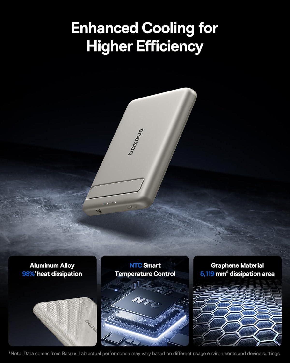Baseus Picogo Power Bank, Smallest 5000mAh Magnetic Portable Charger with Stand, Qi2 Certified 15W Ultra-Mini MagSafe Battery Pack, Alloy Wireless Travel Fast Charger for iPhone 17/16 Series(Grey)(Black)