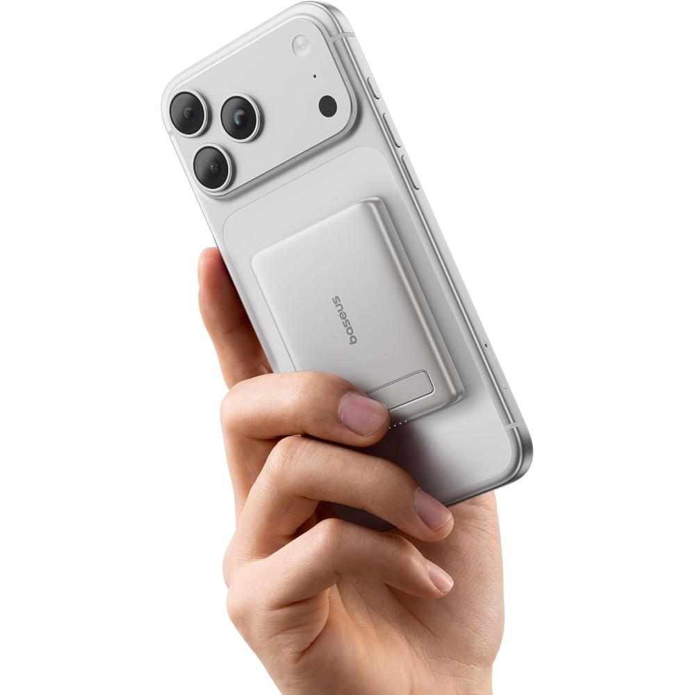 Baseus Picogo Power Bank, Smallest 5000mAh Magnetic Portable Charger with Stand, Qi2 Certified 15W Ultra-Mini MagSafe Battery Pack, Alloy Wireless Travel Fast Charger for iPhone 17/16 Series(Grey)(Natural Titanium)