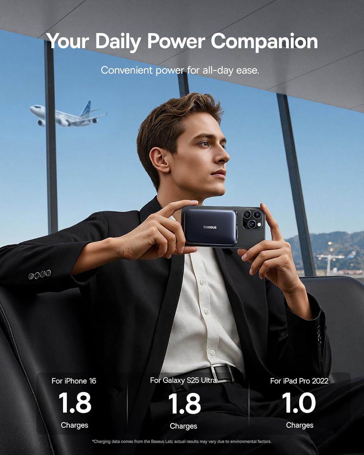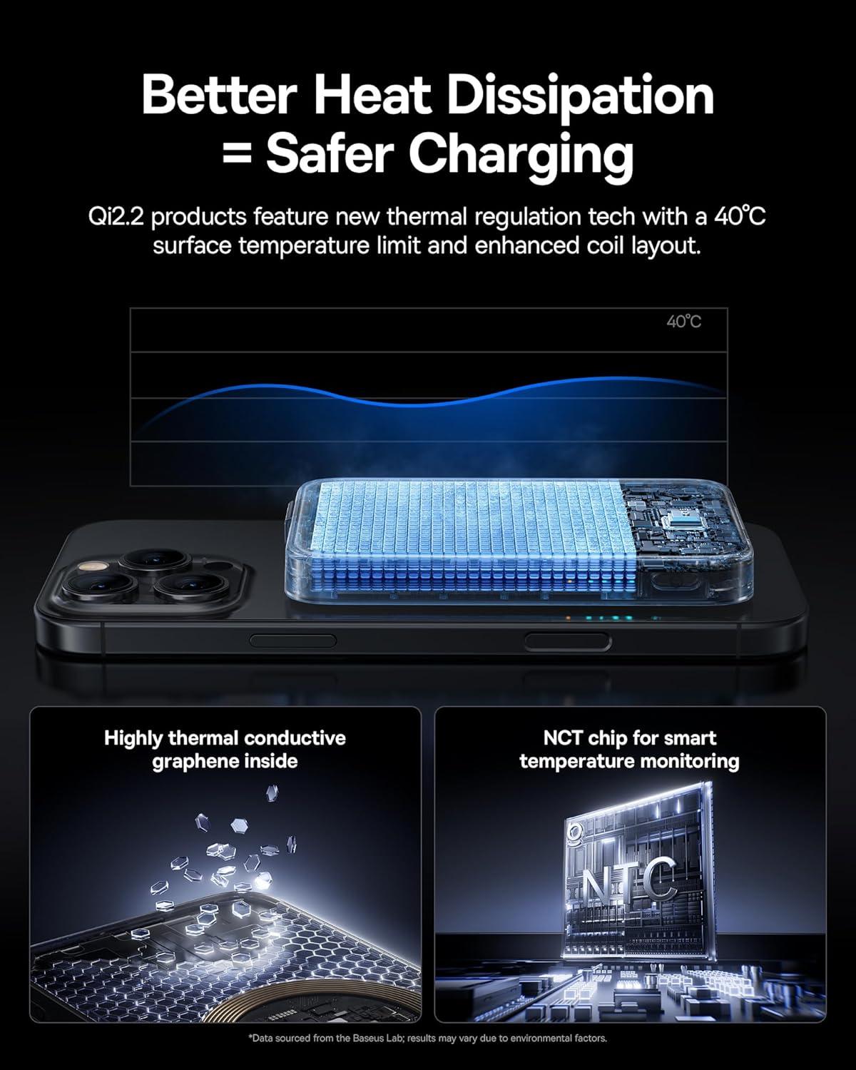 ✅【Advanced Cooling for Safe and Cool Charging】Baseus QI2.2 Power Bank has FCC, UL, TUV, DOE, CEC, UN, RoHS certifications to ensure the safety of use, and can be freely imported into and exported from Europe and the United States. Built with graphene material, upgraded battery cells, and intelligent temperature control, this magnetic charger for iPhone stays cool even during high-speed charging. Protect your devices from overheating and battery damage.