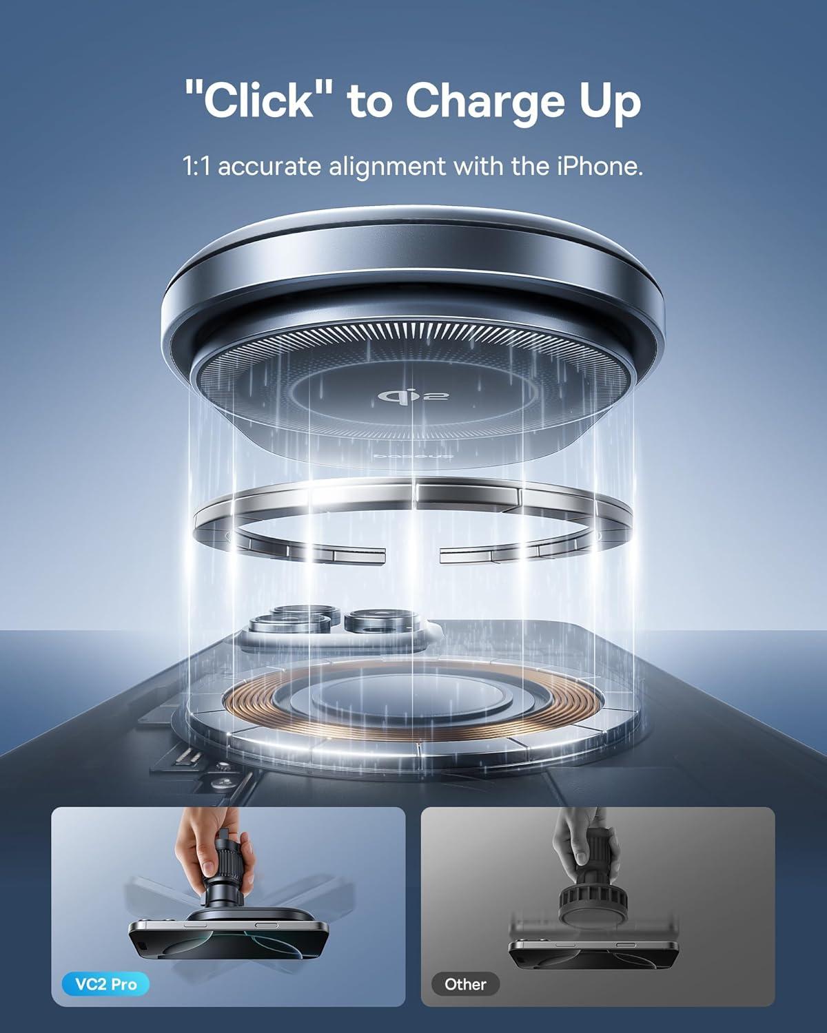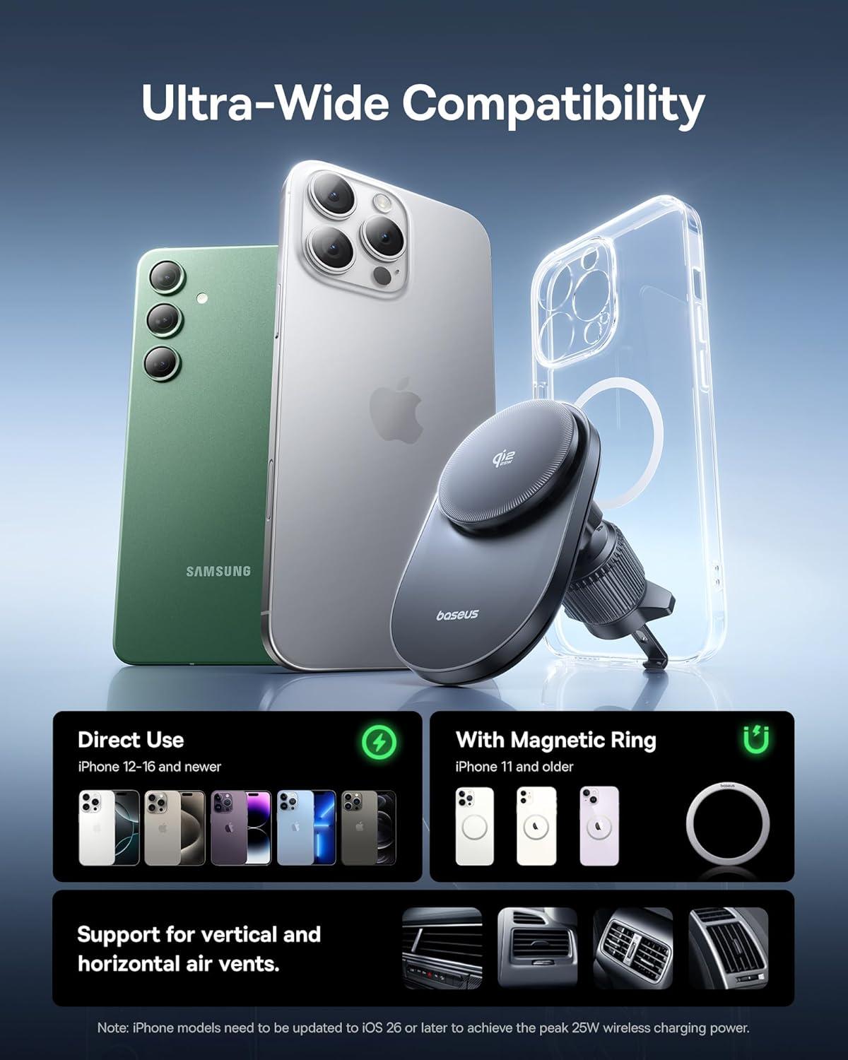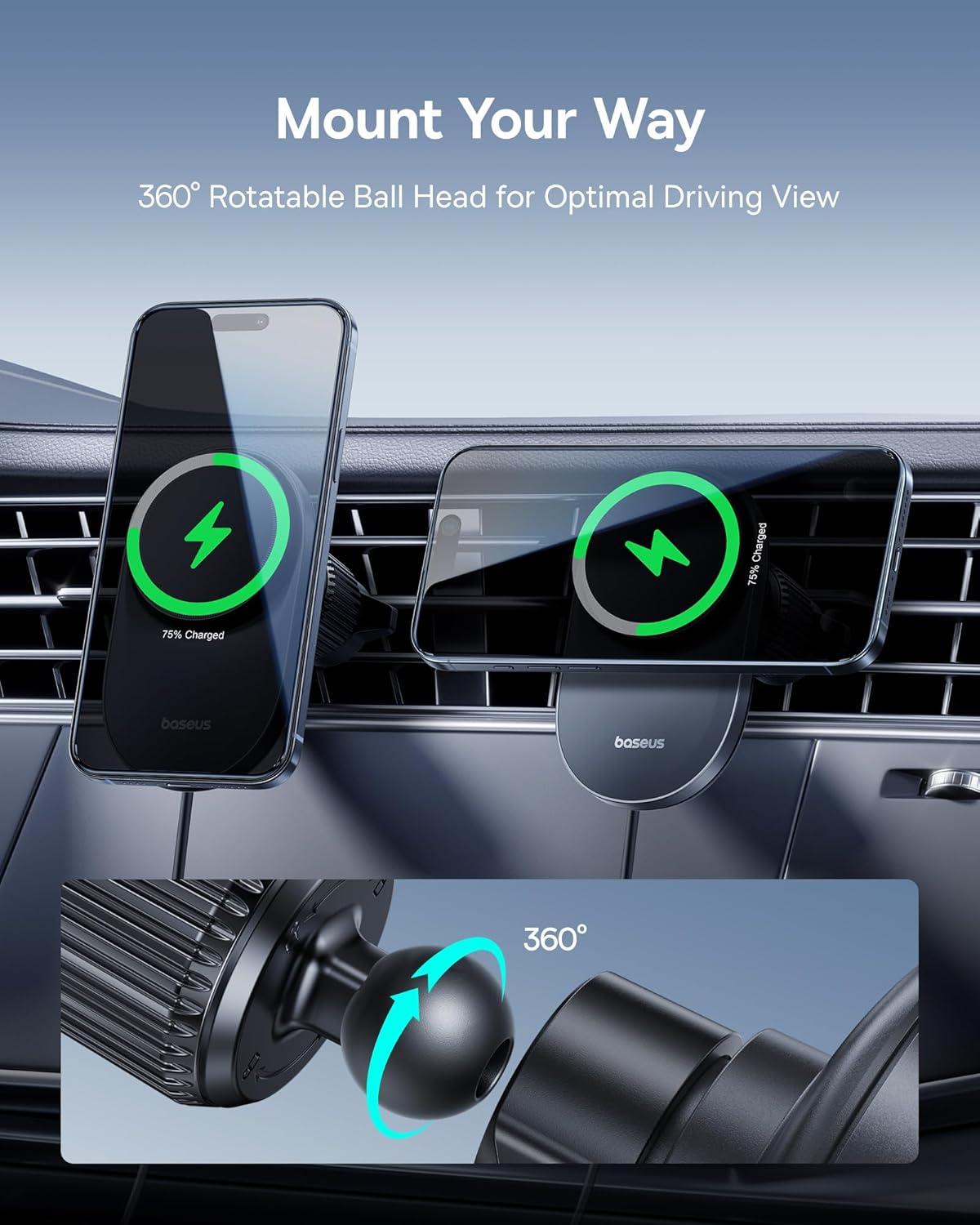 The First Qi2.2-Certified Magnetic Wireless Mount: For the first time a charging car mount features Qi2.2. Compatible with iPhone and Android, the 25W fast charge boosts your phone's charging speed by an incredible 164%, offering outstanding charging efficiency and more power on the go.