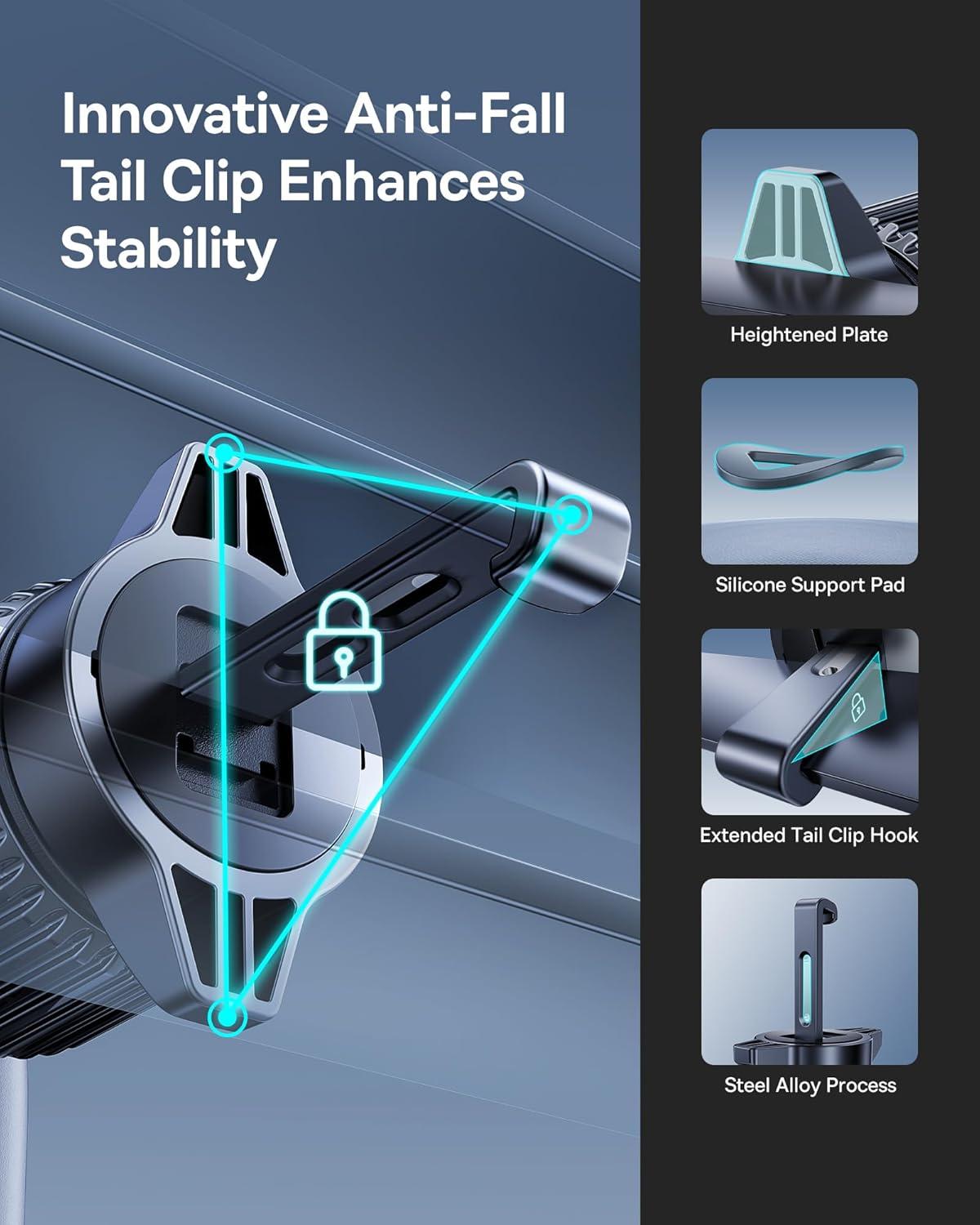 Steady Structure for the Phone: The tail clip is a rock-solid magnetic hold that creates a firm foundation in your car to keep your phone perfectly aligned for consistent charging, stays perfectly stable and accessible through every bump and turn.