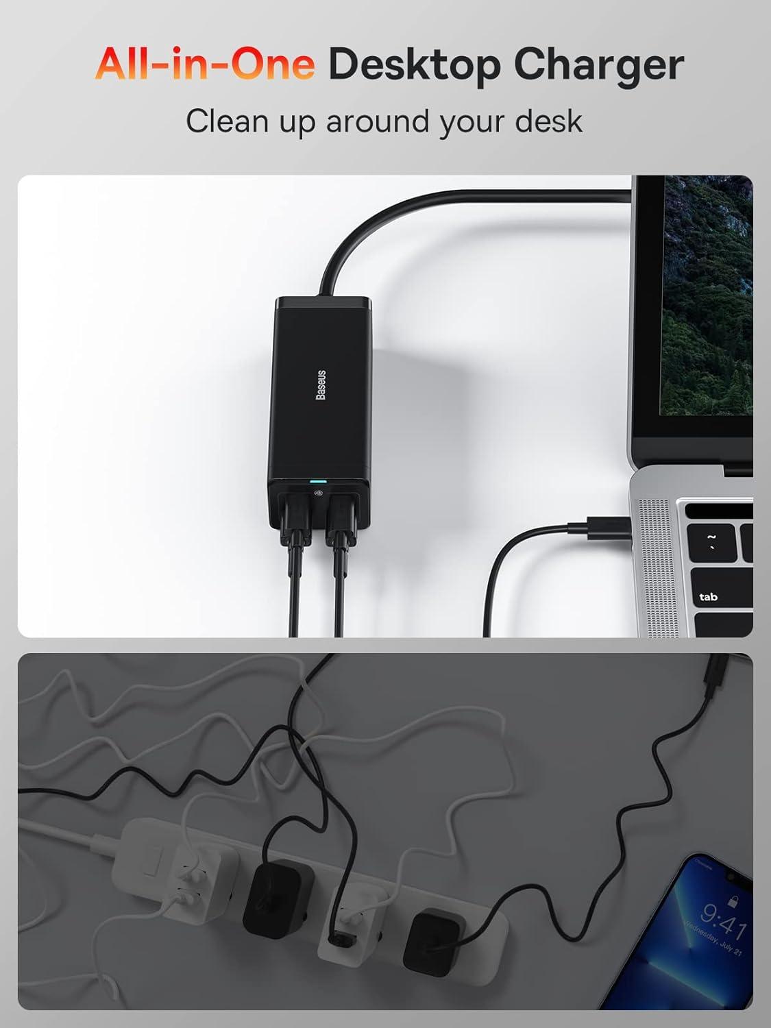 【Fast Charging Desktop Charger】Baseus USB C charger can full charge a Macbook Pro in less than 2 hrs, an iPhone 15 up to 5× faster than with a standard 5V/2.4A chargers, and charge the latest Samsung phones at full speed with Samsung Super Fast Charging. (Tips: 100W Type-C cable is included for fast charging experience.)
