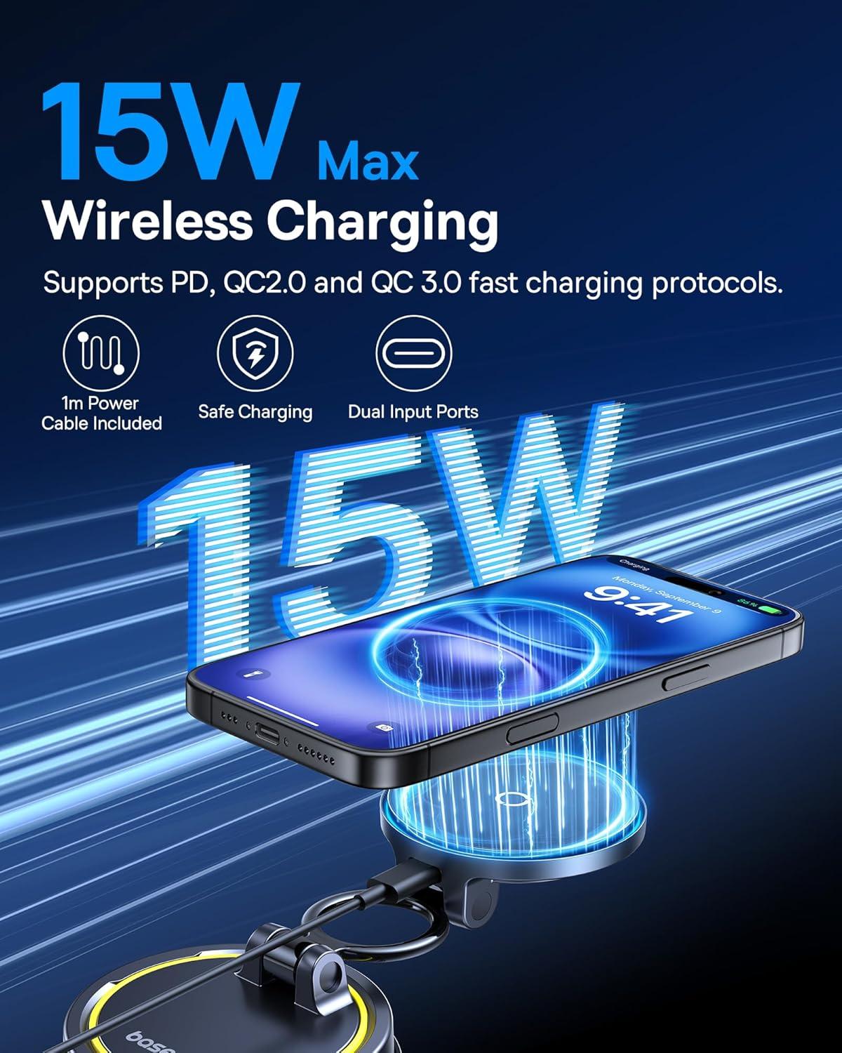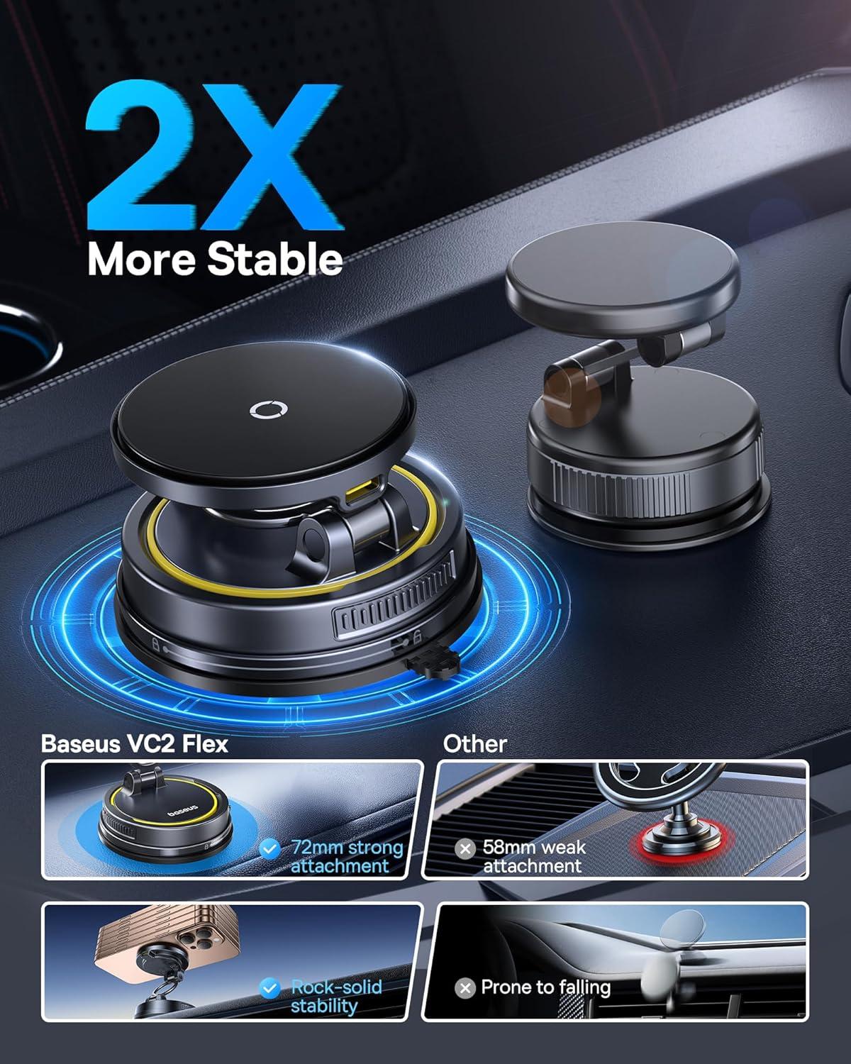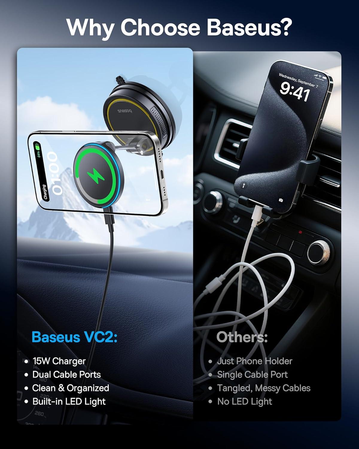 15W Wireless Charging: Baseus VC2 Flex Pro offers an upgraded 15W wireless fast charging compared to the VC2 Flex, delivering stable power with efficient heat dissipation. The built-in two cable ports provides tangle-free seamless connection, keeping your devices powered up anytime while enjoying a perfect navigation view without obstruction