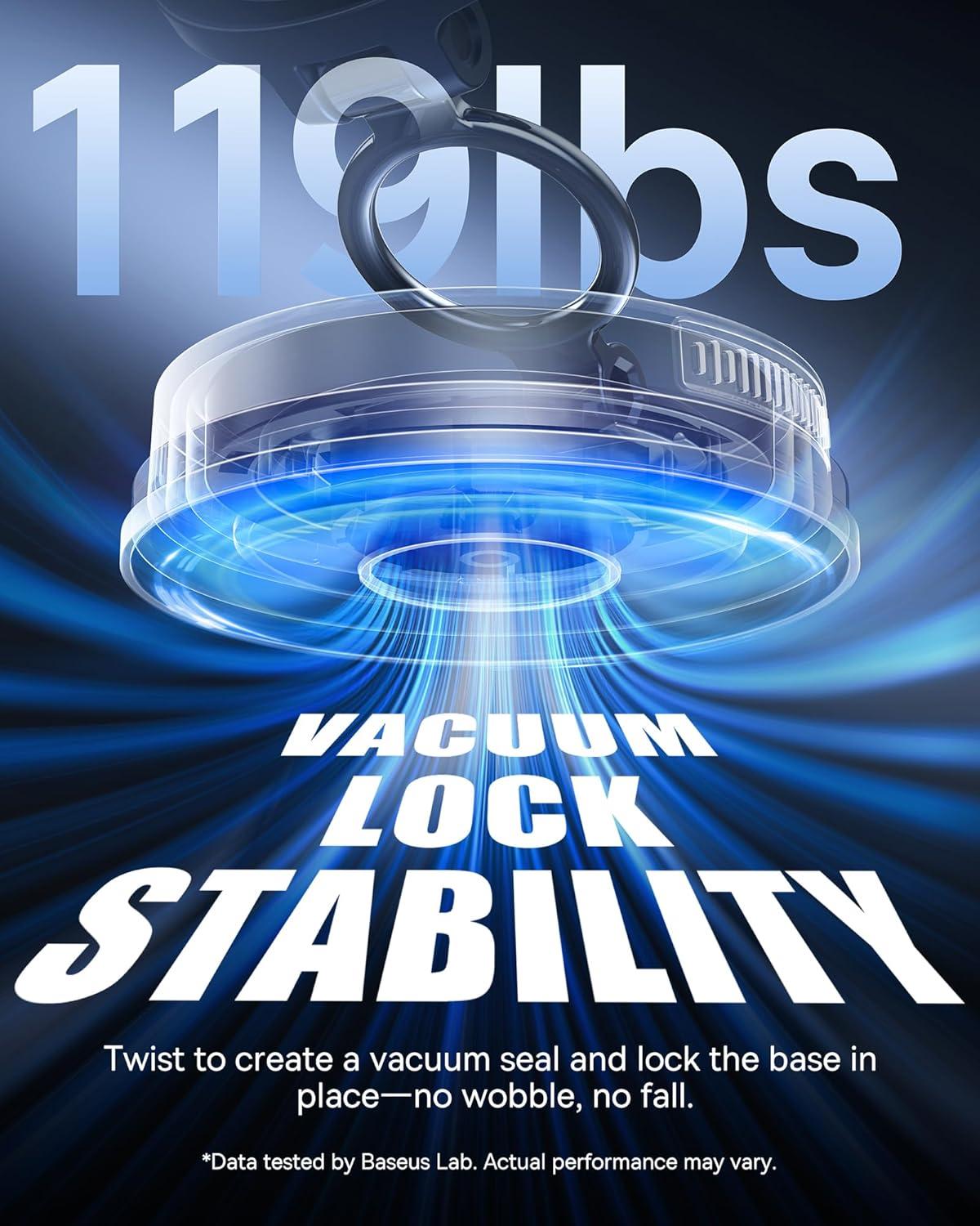 Vacuum Lock Stability: Simply twist to activate the vacuum seal and lock the base in place. Powered by Baseus premium vacuum tech and washable gel, this car mount holds up to 119 lbs without any shifting or wobble. Widely compatiable with leather, faux leather, pebbled surfaces, glass, plastic and other mainstream interiors