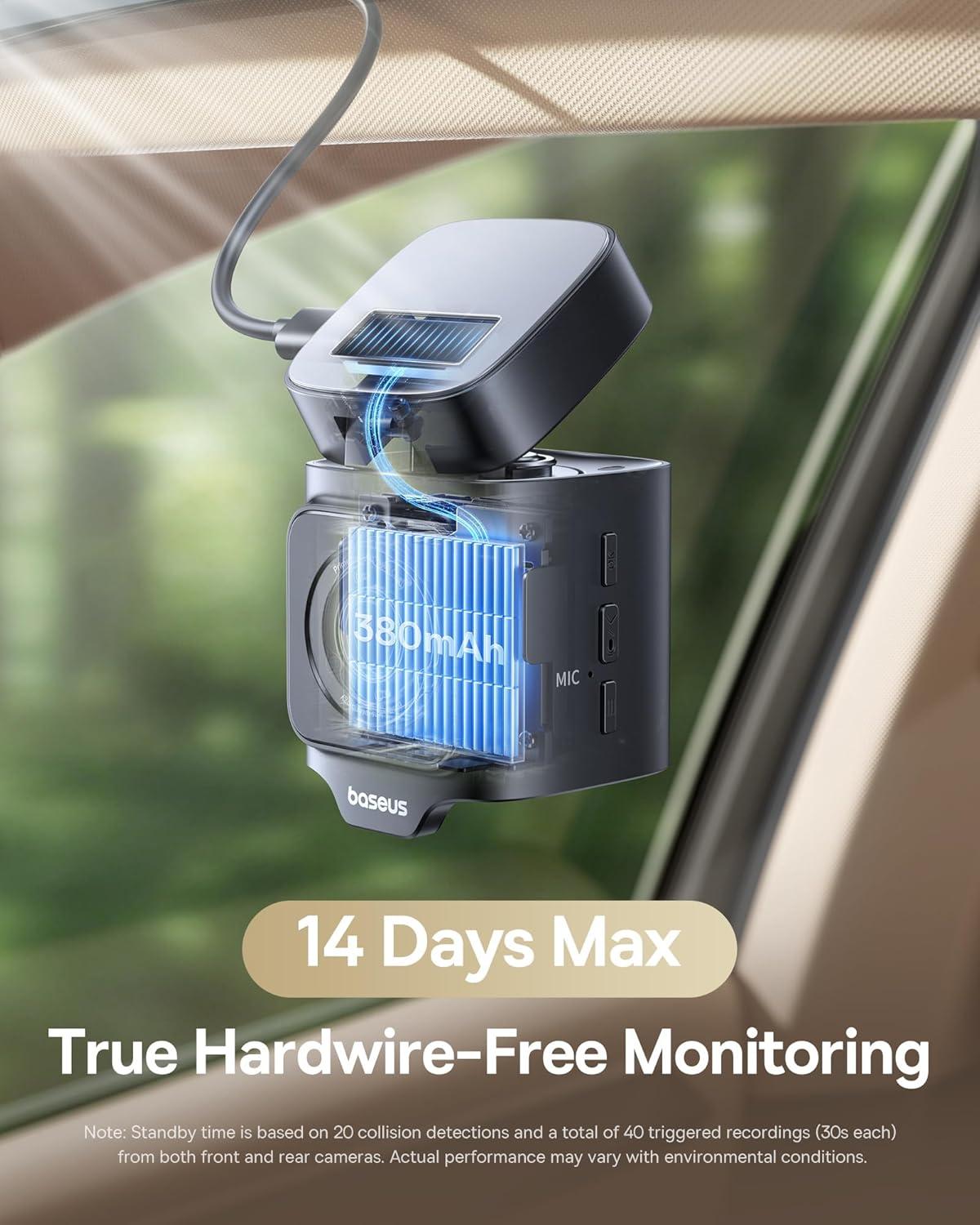 Solar-Powered & Battery-Assisted Protection: With Baseus’ Solar Sync System and a built-in lithium battery, enjoy up to 14 days of parking protection — no hardwire kit or complex wiring required. After the car is turned off, the dash cam automatically enters a low-power standby mode and records a 30-second event clip only when a collision is detected. (Solar and battery power maintain parking protection and event-triggered recording, not continuous recording.)